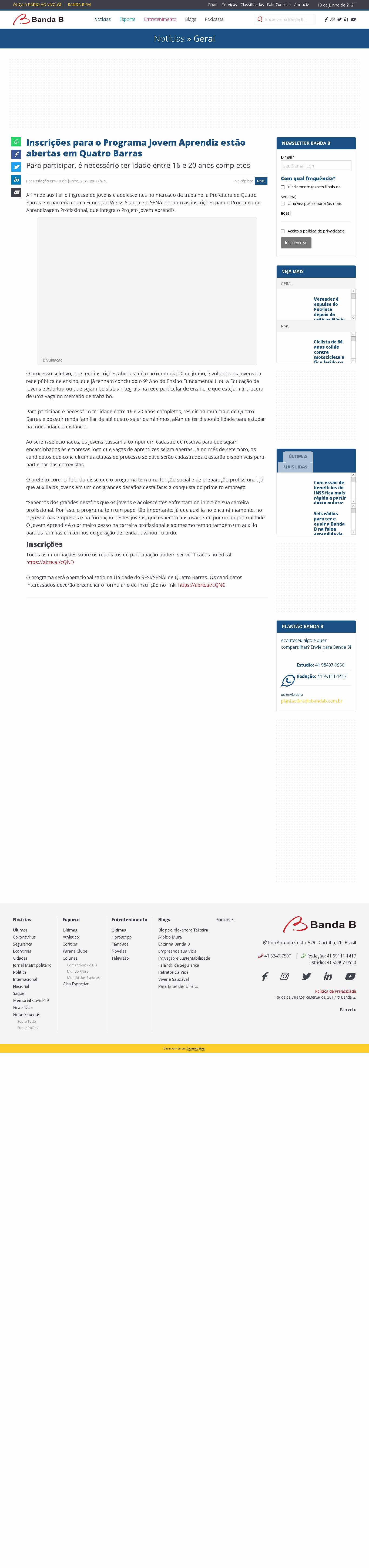 A fim de auxiliar o ingresso de jovens e adolescentes no mercado de trabalho, a Prefeitura de Quatro Barras em parceria com a Fundação Weiss Scarpa e o SENAI abriram as inscrições para o Programa de Aprendizagem Profissional, que integra o Projeto Jovem Aprendiz.