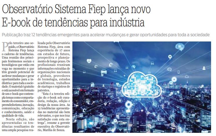 Pelo terceiro ano seguido, o Observatório Sistema Fiep lança o caderno de tendências. Uma reunião dos principais fenômenos sociais e tecnológicos que estão em voga no momento e que têm grande potencial de acelerar mudanças e gerar oportunidades para a indústria e para toda a sociedade. O material é gratuito e está acessível em formato de um e-book que contempla temas como comportamento do consumidor, empreendedorismo, inovação, comunicação, educação e conhecimento, saúde e qualidade de vida. Nesta edição, são apresentadas 12 tendências resultantes de uma ampla pesquisa realizada pelo Observatório Sistema Fiep, área com experiência de 17 anos em estudos de futuro, prospectiva e planejamento de longo prazo. Os profissionais reuniram informações extraídas de organizações nacionais e globais, provedores de tecnologia, estudos acadêmicos, trabalhos de startups e registros de patentes. “Esta é a terceira edição do e-book sob curadoria, redação, edição e design da nossa área. As 12 tendências apresentadas no material são bem relevantes, o que nos traz satisfação com esta entrega”, resume a gerente executiva do Observatório, Marilia de Souza.