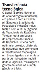 O Senai (Serviço Nacional de Aprendizagem Industrial), em parceria com a Embrapii (Empresa Brasileira de Pesquisa e Inovação Industrial) e com a TACR (Agência de Tecnologia da República Tcheca), está em busca de empresas do Brasil e da República Tcheca para estimular projetos bilaterais de pesquisa, que promovam a transferência tecnológica em áreas ligadas a energia a partir de hidrogênio, mobilidade e logística, reciclagem e gestão de resíduos e inteligência artificial.