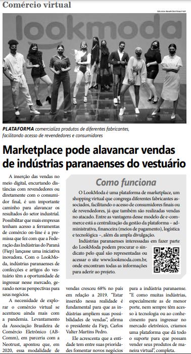 Federação das Indústrias do Paraná (Fiep) lançasse uma iniciativa inovadora. Com o LookModa, indústrias paranaenses de confecções e artigos do vestuário têm a oportunidade de ingressar nesse mercado, gerando novas perspectivas para seus negócios. A necessidade de explorar o comércio virtual se acentuou ainda mais com a pandemia. Levantamento da Associação Brasileira de Comércio Eletrônico (ABComm), em parceria com a Neotrust, apontou que, em 2020, essa modalidade de vendas cresceu 68% no país em relação a 2019. “Estar inserido nessa realidade é fundamental para que as indústrias ampliem suas possibilidades de vendas”, afi rma o