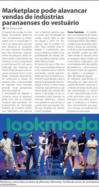 Federação das Indústrias do Paraná (Fiep) lançasse uma iniciativa inovadora. Com o LookModa, indústrias paranaenses de confecções e artigos do vestuário têm a oportunidade de ingressar nesse mercado, gerando novas perspectivas para seus negócios. A necessidade de explorar o comércio virtual se acentuou ainda mais com as restrições impostas pela pandemia. Um levantamento da Associação Brasileira de Comércio Eletrônico (ABComm), em parceria com a Neotrust, apontou que, em 2020, essa modalidade de vendas cresceu 68% no país em relação a 2019. Um movimento que se mantém em 2021. “Estar inserido nessa realidade é fundamental para que as indústrias ampliem suas possibilidades de vendas”, afirma o