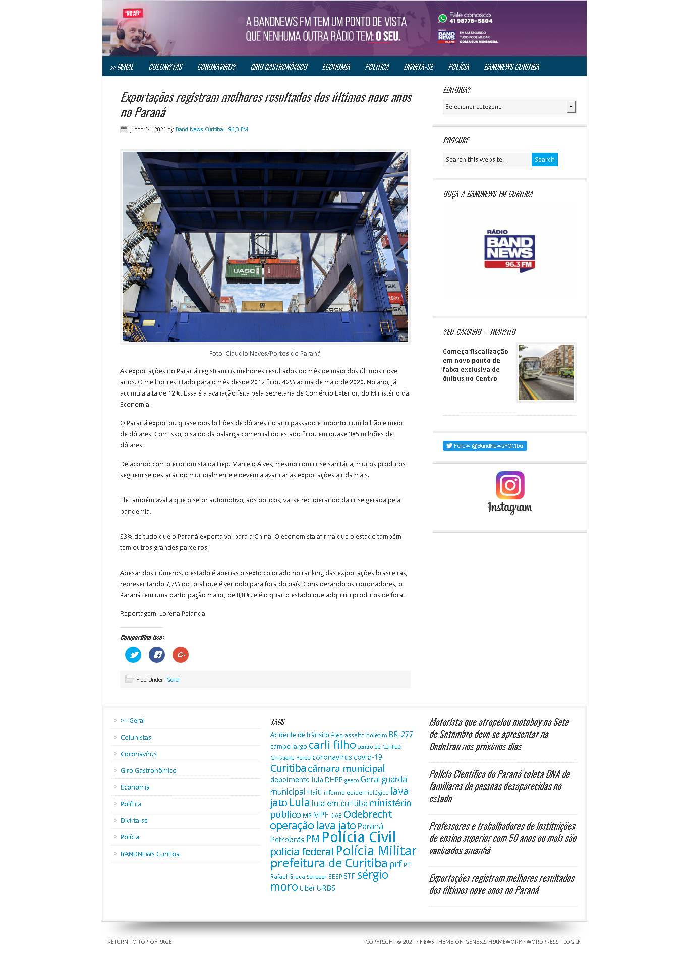 Paraná registram os melhores resultados do mês de maio dos últimos nove anos. O melhor resultado para o mês desde 2012 ficou 42% acima de maio de 2020. No ano, já acumula alta de 12%. Essa é a avaliação feita pela Secretaria de Comércio Exterior, do Ministério da Economia.