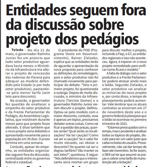 Pedágio, da Assembleia Legislativa, que insistiram durante meses para que projeto fosse alterado. E disse também que o novo projeto seria debatido e apresentado novamente para a população em 30 dias. O prazo termina em uma semana. Contudo, apesar do empenho, as entidades organizadas seguem fora da discussão, centralizada entre os governos federal e estadual. O presidente do POD (Programa Oeste em Desenvolvimento), Rainer Zielasko, explica que as entidades terão de aguardar a apresentação da nova proposta para conhecer as definições da remodelagem, pois o setor produtivo não foi chamado novamente para participar do debate. “Veio o primeiro projeto, foi questionada a outorga. Depois de muita discussão, o ministro da Infraestrutura [Tarcísio Gomes] e o governador Ratinho Junior vieram discutir o projeto. Definiu. Optou-se pelo modelo com o maior desconto, contudo, esse é apenas um tópico, precisamos debater outras coisas. Como vai ficar a questão das praças, quantas serão? Qual serão as localizações? Vai ter caução? Como vai ser a caução? Se o valor for muito elevado, vai obstar o desconto? De quanto vai ser o degrau tarifário? Vão manter os seis lotes?”, questiona. E segue: “Nós defendemos que o interessante seria montar um grupo para discutir melhor o projeto, incluindo a