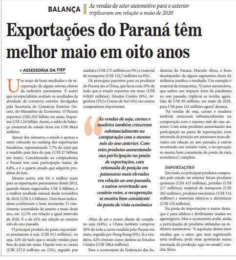Um maio de bons resultados e de recuperação de alguns setores-chaves da indústria paranaense. É assim que os especialistas avaliam os resultados da atividade de comércio exterior divulgados pela Secretaria de Comércio Exterior (Secex), do Ministério da Economia. O Paraná exportou US$1,932 bilhão em maio. Importou US$ 1,54 bilhão. Assim, o saldo da balança comercial do estado fi cou em US$ 384,6 milhões. Apesar dos números, o estado é apenas o sexto colocado no ranking das exportações brasileiras, representando 7,7% do total que é vendido para fora do país (US$ 27 bilhões em maio). Considerando os compradores, o Paraná tem uma participação maior, de 8,8%, e é o quarto estado que adquiriu produtos de fora. Mesmo assim, este foi o melhor maio para as exportações paranaenses desde 2012, quando foram negociados US$ 2 bilhões, e o melhor resultado mensal desde novembro de 2018 (US$ 3,1 bilhões). Dois bons indicadores confi rmam o bom momento. O crescimento acumulado de janeiro a maio deste ano, em 12,5% em relação a igual intervalo de 2020. E o de 42% em relação ao mesmo mês do ano passado. O principal produto da pauta exportadora paranaense é soja (US$ 811 milhões), ou seja, 42% de tudo que o estado vendeu para fora do país em maio. Depois vem as carnes (US$ 257,9 milhões ou 13%), seguido por madeira (US$ 175 milhões ou 9%) e material de transporte (US$ 152,7 milhões ou 8%). Os principais parceiros para os produtos do Paraná são a China, que fi cou com 33% de tudo que o estado exportou em maio (US$ 638,83 milhões). Estados Unidos (8%), Argentina (5%) e Coreia do Sul (4%) são outros compradores importantes. Além de ser o maior cliente de complexo soja (64%), a China também comprou 20% de toda a carne vendida pelo Paraná em maio, seguida por Hong Kong (6%). Já a madeira, 62% tiveram como destino os Estados Unidos (US$ 108,6 milhões). Para o economista da