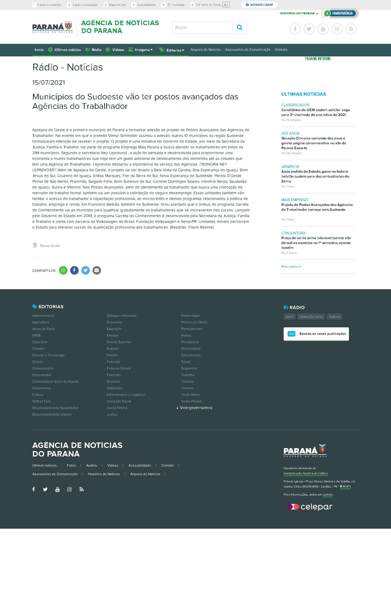 Paraná e busca atender os trabalhadores em todos os 399 municípios. Segundo o secretário Ney Leprevost , a ação foi pensada e desenvolvida para proporcionar uma economia a muitos trabalhadores que hoje tem um gasto adicional de deslocamento dos domicílios até as cidades que têm uma Agência do Trabalhador. Leprevost destacou a importância do serviço das Agências. //SONORA NEY LEPREVOST//Além de Itapejara do Oeste, o projeto vai ser levado a Bela Vista da Caroba, Boa Esperança do Iguaçu, Bom Jesus do Sul, Cruzeiro do Iguaçu, Enéas Marques, Flor da Serra do Sul, Nova Esperança do Sudoeste, Pérola D?Oeste, Pinhal de São Bento, Pranchita, Salgado Filho, Bom Sucesso do Sul, Coronel Domingos Soares, Honório Serpa, Saudades do Iguaçu, Sulina e Vitorino.Nos Postos Avançados, além do atendimento ao trabalhador que busca uma colocação do mercado de trabalho formal, também vai ser possível a solicitação do seguro desemprego. Essas unidades também vão facilitar o acesso do trabalhador à capacitação profissional, ao microcrédito e demais programas relacionados à política de trabalho, emprego e renda.Em Francisco Beltrão, também no Sudoeste, ficou acertado que o ônibus do programa Carreta do Conhecimento vai ao município para qualificar gratuitamente os trabalhadores que se inscreverem nos cursos.Lançado pelo Governo do Estado em 2019, o programa Carreta do Conhecimento é desenvolvido pela Secretaria da Justiça, Família e Trabalho e conta com parceria da Volkswagen do Brasil, Fundação Volkswagen e