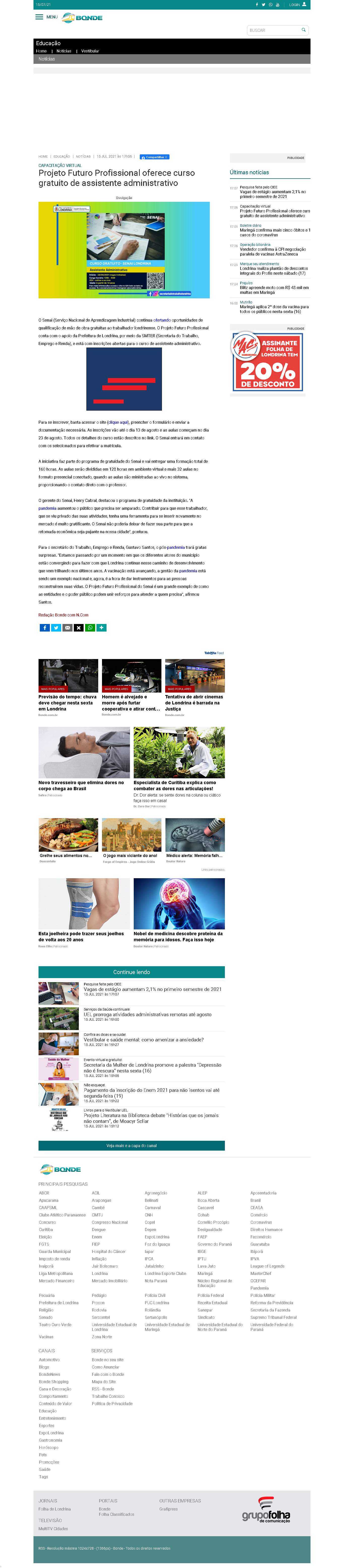 O Senai (Serviço Nacional de Aprendizagem Industrial) continua ofertando oportunidades de qualificação de mão de obra gratuitas ao trabalhador londrinense. O Projeto Futuro Profissional conta com o apoio da Prefeitura de Londrina, por meio da SMTER (Secretaria do Trabalho, Emprego e Renda), e está com inscrições abertas para o curso de assistente administrativo.
