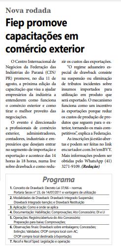 Federação das Indústrias do Paraná (CIN/ PR) promove, no dia 11 de agosto, a próxima edição da capacitação que visa a ajudar empresários da indústria a entenderem como funciona o comércio exterior e como tirar o melhor proveito das negociações. O evento é direcionado a profi ssionais de comércio exterior, administradores, contadores, industriais e empresários que desejam entrar no segmento de importação e exportação e acontece das 14 horas às 18 horas, numa live sobre drawback e como reduzir os custos das exportações. “O regime aduaneiro especial de drawback consiste na suspensão ou eliminação de tributos incidentes sobre insumos importados para utilização em produto que será exportado. O mecanismo funciona como um incentivo às exportações porque reduz os custos de produção de produtos que seguem para o exterior, tornando-os mais competitivos”, explica a Federação. As inscrições já estão abertas e podem ser feitas no link encurtador.com.br/emBVY. Mais informações podem ser obtidas pelo WhatsApp (41) 3271-9109. (Redação)