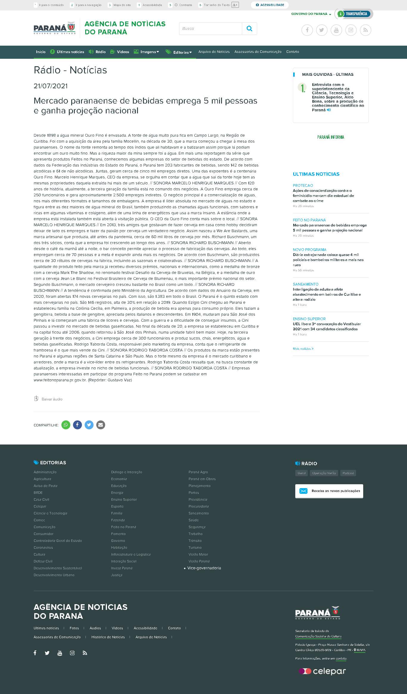Federação das Indústrias do Estado do Paraná, o Paraná tem 203 fabricantes de bebidas, sendo 142 de bebidas alcoólicas e 61 de não alcoólicas. Juntas, geram cerca de cinco mil empregos diretos. Uma das expoentes é a centenária Ouro Fino. Marcelo Henrique Marques, CEO da empresa, se orgulha em contar que a água que sai da fonte hoje tem as mesmas propriedades daquela extraída há mais de um século. // SONORA MARCELO HENRIQUE MARQUES // Com 120 anos de história, atualmente, a terceira geração da família está no comando dos negócios. A Ouro Fino emprega cerca de 250 funcionários e gera aproximadamente 2.500 empregos indiretos. O negócio principal é a comercialização de águas, nos mais diferentes formatos e tamanhos de embalagens. A empresa é líder absoluta no mercado de águas no estado e figura entre as dez maiores de água mineral do Brasil, também produzindo as chamadas águas funcionais, com sabores e ricas em algumas vitaminas e colágeno, além de uma linha de energéticos que usa a marca Insano. A estância onde a empresa está instalada também está aberta à visitação pública. O CEO da Ouro Fino conta mais sobre o local. // SONORA MARCELO HENRIQUE MARQUES // Em 2013, três amigos que gostavam de fazer cerveja em casa como hobby decidiram deixar de lado os empregos e fazer da paixão por cerveja um verdadeiro negócio. Assim nasceu a We Are Bastards, uma marca artesanal que produzia, até antes da pandemia, cerca de 60 mil litros de cerveja por mês. Richard Buschmann, um dos três sócios, conta que a empresa foi crescendo ao longo dos anos. // SONORA RICHARD BUSCHMANN // Aberto desde o café da manhã até a noite, o bar conceito permite apreciar o processo de fabricação das cervejas. Ao todo, eles empregam cerca de 70 pessoas e a meta é expandir ainda mais os negócios. De acordo com Buschmann, são produzidos cerca de 30 rótulos de cervejas na fábrica, incluindo as sazonais e colaborativas. // SONORA RICHARD BUSCHMANN // A qualidade do produto feito pela marca já recebeu diversos prêmios, nacionais e internacionais, como a medalha de bronze com a cerveja Mark The Shadow, no renomado festival Desafio da Cerveja de Bruxelas, na Bélgica, e a medalha de ouro com a cerveja Jean Le Blanc no Festival Brasileiro de Cerveja de Blumenau, o mais importante prêmio nacional do setor. Segundo Buschmann, o mercado cervejeiro cresceu bastante no Brasil como um todo. // SONORA RICHARD BUSCHMANN // A tendência é confirmada pelo Ministério da Agricultura. De acordo com dados do Anuário da Cerveja, em 2020, foram abertas 174 novas cervejarias no país. Com isso, são 1.383 em todo o Brasil. O Paraná é o quinto estado com mais cervejarias no país. São 146 registros, alta de 30% em relação a 2019. Quando Ezígio Cini chegou ao Paraná e estabeleceu família na Colônia Cecília, em Palmeira, a produção de bebida era apenas para consumo próprio. Eles faziam a gengibirra, bebida a base de gengibre, apreciada pelos italianos e descendentes. Em 1904, mudaram para São José dos Pinhais e lá começaram uma fábrica de licores e cervejas. Com a guerra e a dificuldade de conseguir insumos, a Cini passou a investir no mercado de bebidas gaseificadas. No final da década de 20, a empresa se estabeleceu em Curitiba e na capital ficou até 2006, quando retornou à São José dos Pinhais, numa unidade fabril bem maior. Hoje, na terceira geração à frente dos negócios, a Cini emprega cerca de 300 funcionários e produz sucos, chás, energéticos, água e bebidas gaseificadas. Rodrigo Taborda Costa, responsável pelo marketing da empresa, conta que o refrigerante de framboesa é o que mais vende da Cini. // SONORA RODRIGO TABORDA COSTA // Os produtos da marca estão presentes no Paraná e algumas regiões de Santa Catarina e São Paulo. Mas o forte mesmo da empresa é o mercado curitibano e arredores, onde a marca é a vice-líder entre os refrigerantes. Rodrigo Taborda Costa ressalta que, na busca constante de atualização, a empresa investe no nicho de bebidas funcionais. // SONORA RODRIGO TABORDA COSTA // Empresas paranaenses interessadas em participar do programa Feito no Paraná podem se cadastrar em www.feitonoparana.pr.gov.br. (Repórter: Gustavo Vaz)