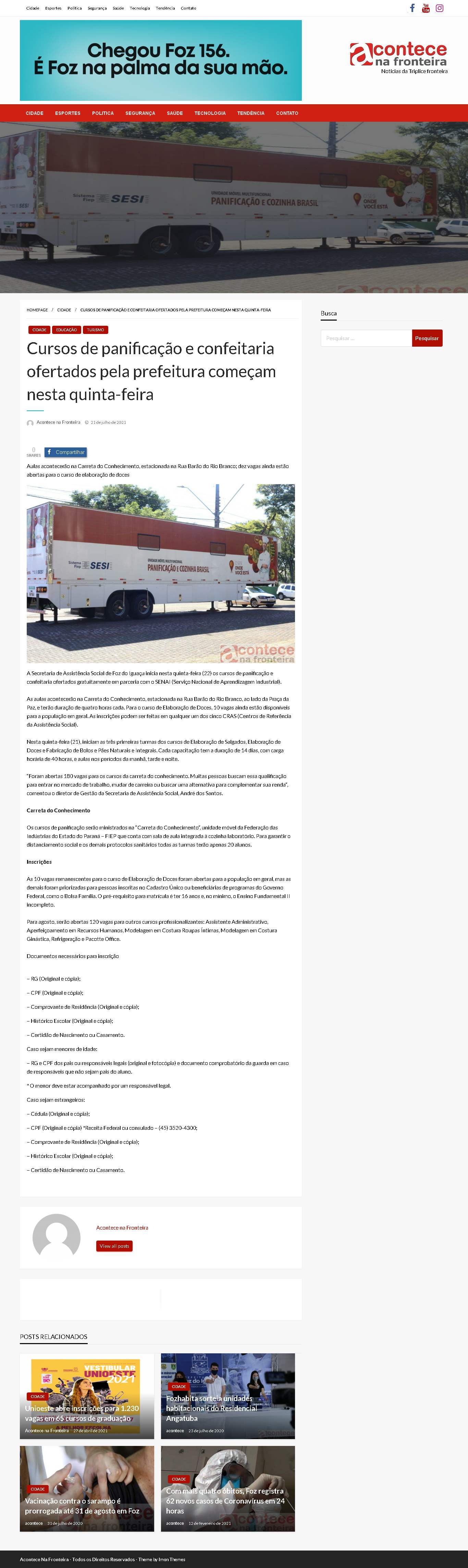 A Secretaria de Assistência Social de Foz do Iguaçu inicia nesta quinta-feira (22) os cursos de panificação e confeitaria ofertados gratuitamente em parceria com o SENAI (Serviço Nacional de Aprendizagem Industrial).