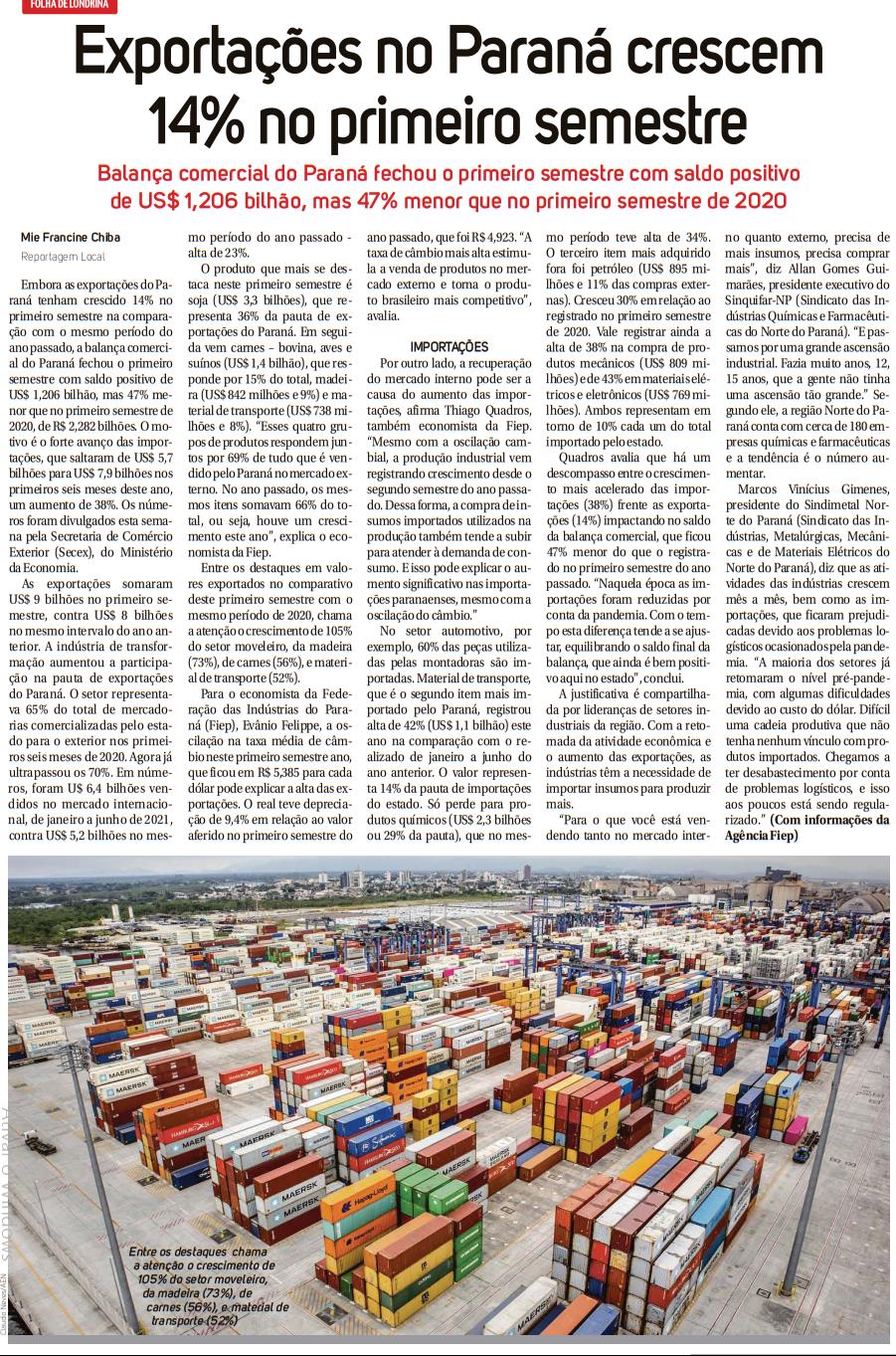 Fiep.Entre os destaques em valores exportados no comparativo deste primeiro semestre com o mesmo período de 2020, chama a atenção o crescimento de 105% do setor moveleiro, da madeira (73%), de carnes (56%), e material de transporte (52%).
