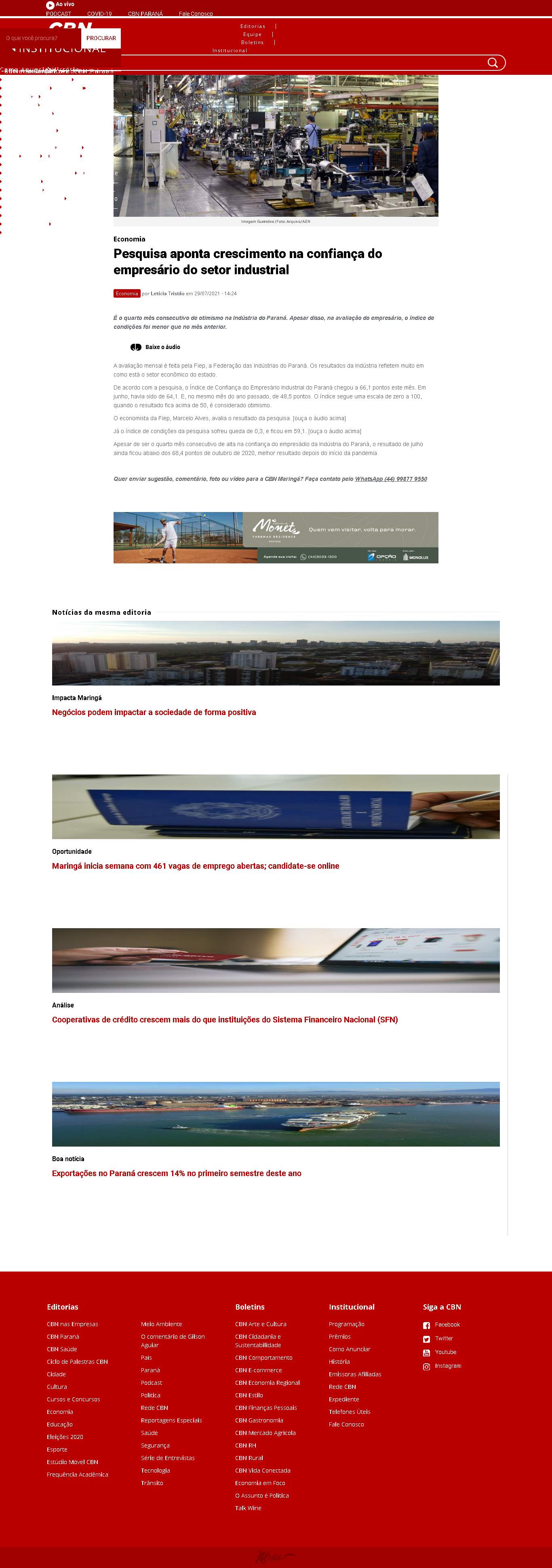 Paraná chegou a 66,1 pontos este mês. Em junho, havia sido de 64,1. E, no mesmo mês do ano passado, de 48,5 pontos. O índice segue uma escala de zero a 100, quando o resultado fica acima de 50, é considerado otimismo.