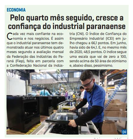 Cada vez mais confiante na economia e nos negócios. É assim que o industrial paranaense tem demonstrado atuar nos últimos quatro meses segundo a avaliação mensal da Federação das Indústrias do Paraná (Fiep), feita em parceria com a Confederação Nacional da Indústria (CNI). O Índice de Confiança do Empresário Industrial (ICEI) em julho chegou a 66,1 pontos. Em junho, havia sido de 64,1. E, no mesmo mês de 2020, 48,5 pontos. O índice segue uma escala que vai de zero a 100, sendo acima de 50 área de otimismo e, abaixo disso, pessimismo.