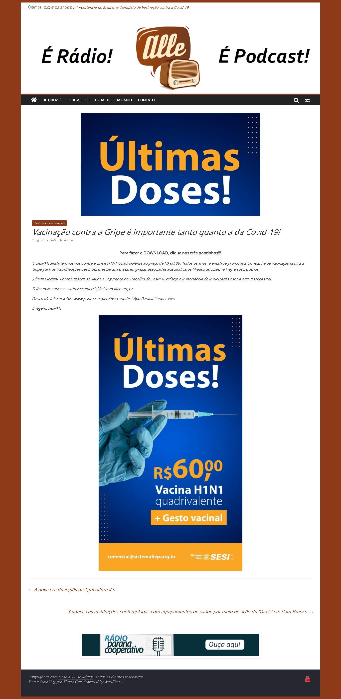 Sesi/PR ainda tem vacinas contra a Gripe H1N1 Quadrivalente ao preço de R$ 60,00. Todos os anos, a entidade promove a Campanha de Vacinação contra a Gripe para os trabalhadores das indústrias paranaenses, empresas associadas aos sindicatos filiados ao Sistema Fiep e cooperativas.
