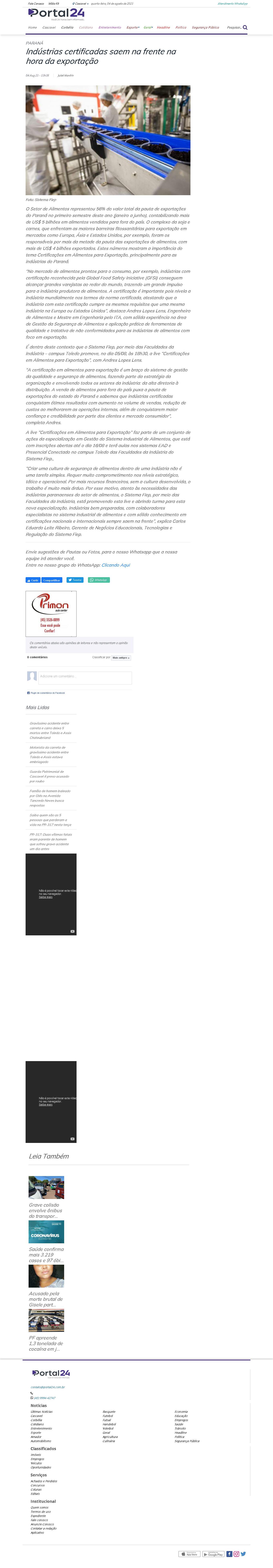 É dentro deste contexto que o Sistema Fiep, por meio das Faculdades da Indústria - campus Toledo promove, no dia 05/08, às 18h30, a live “Certificações em Alimentos para Exportação”, com Andres Lopes Lens.