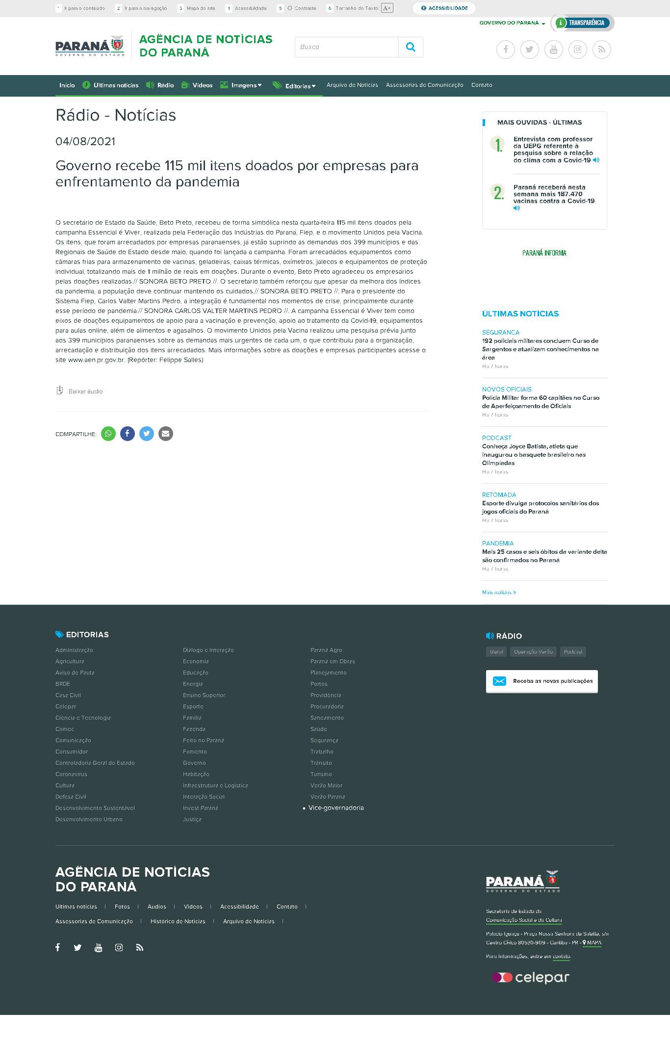 Sistema Fiep, Carlos Valter Martins Pedro, a integração é fundamental nos momentos de crise, principalmente durante esse período de pandemia.// SONORA CARLOS VALTER MARTINS PEDRO //.A campanha Essencial é Viver tem como eixos de doações equipamentos de apoio para a vacinação e prevenção, apoio ao tratamento da Covid-19, equipamentos para aulas online, além de alimentos e agasalhos.O movimento Unidos pela Vacina realizou uma pesquisa prévia junto aos 399 municípios paranaenses sobre as demandas mais urgentes de cada um, o que contribuiu para a organização, arrecadação e distribuição dos itens arrecadados.Mais informações sobre as doações e empresas participantes acesse o site www.aen.pr.gov.br. (Repórter: Felippe Salles)