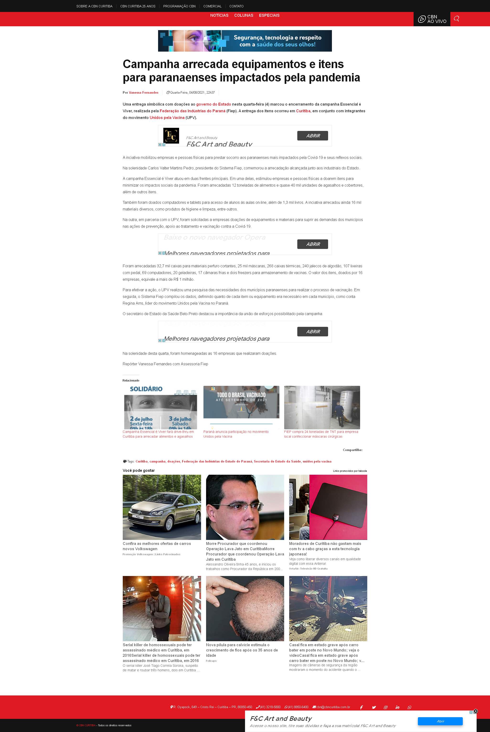 Uma entrega simbólica com doações ao governo do Estado nesta quarta-feira (4) marcou o encerramento da campanha Essencial é Viver, realizada pela Federação das Indústrias do Paraná (Fiep). A entrega dos itens ocorreu em Curitiba, em conjunto com integrantes do movimento Unidos pela Vacina (UPV).