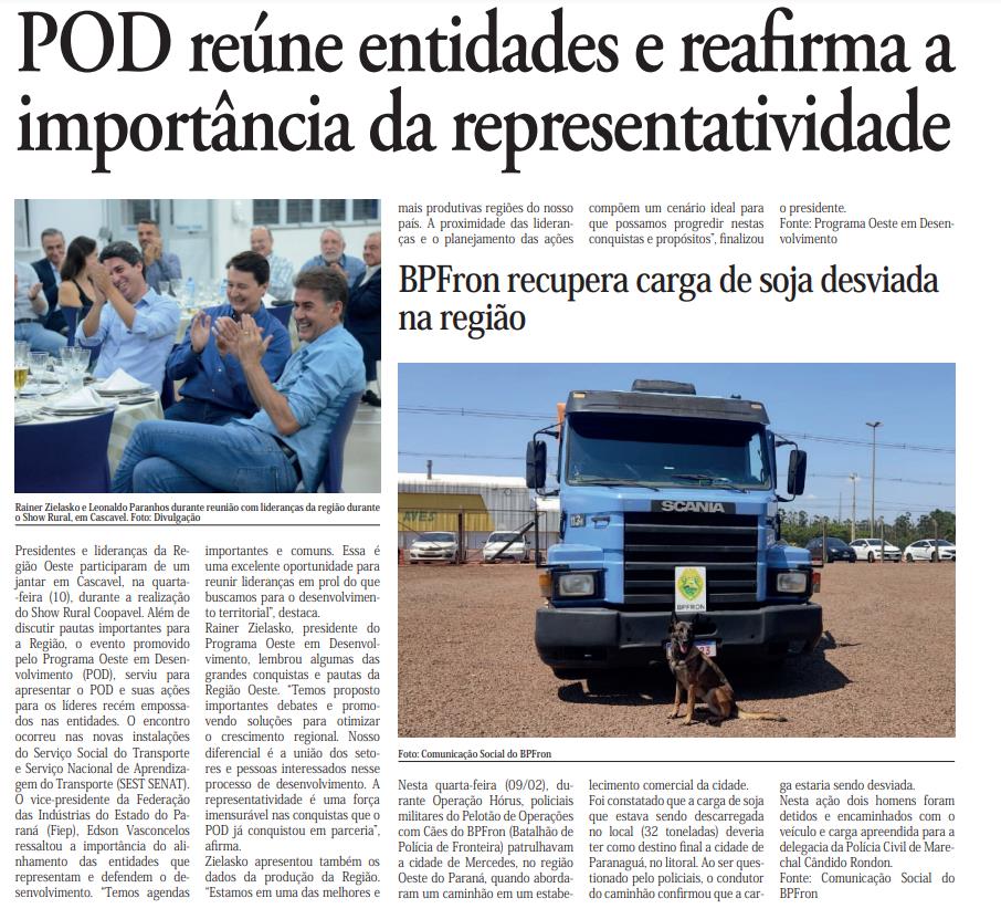 Presidentes e lideranças da Região Oeste participaram de um jantar em Cascavel, na quarta- -feira (10), durante a realização do Show Rural Coopavel. Além de discutir pautas importantes para a Região, o evento promovido pelo Programa Oeste em Desenvolvimento (POD), serviu para apresentar o POD e suas ações para os líderes recém empossados nas entidades. O encontro ocorreu nas novas instalações do Serviço Social do Transporte e Serviço Nacional de Aprendizagem do Transporte (SEST SENAT). O vice-presidente da Federação das Indústrias do Estado do Paraná (Fiep), Edson Vasconcelos ressaltou a importância do alinhamento das entidades que representam e defendem o desenvolvimento. “Temos agendas importantes e comuns. Essa é uma excelente oportunidade para reunir lideranças em prol do que buscamos para o desenvolvimento territorial”, destaca. Rainer Zielasko, presidente do Programa Oeste em Desenvolvimento, lembrou algumas das grandes conquistas e pautas da Região Oeste. “Temos proposto importantes debates e promovendo soluções para otimizar o crescimento regional. Nosso diferencial é a união dos setores e pessoas interessados nesse processo de desenvolvimento. A representatividade é uma força imensurável nas conquistas que o POD já conquistou em parceria”, afirma. Zielasko apresentou também os dados da produção da Região. “Estamos em uma das melhores e Rainer Zielasko e Leonaldo Paranhos durante reunião com lideranças da região durante o Show Rural, em Cascavel. Foto: Divulgação mais produtivas regiões do nosso país. A proximidade das lideranças e o planejamento das ações compõem um cenário ideal para que possamos progredir nestas conquistas e propósitos”, finalizou o presidente. Fonte: Programa Oeste em Desenvolvimento