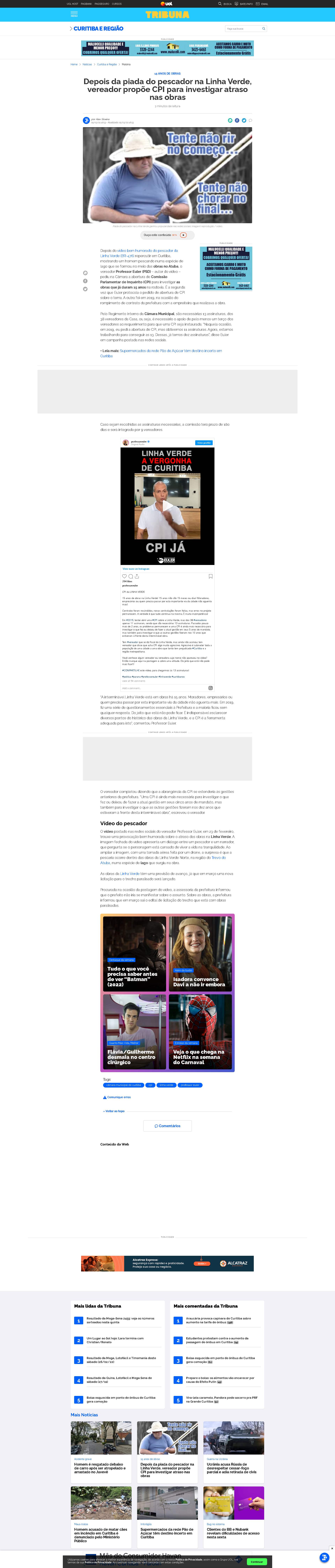 Curitiba, mostrando um homem pescando numa espécie de lago que se formou no meio das obras no Atuba, o vereador Professor Euler (PSD) - autor do vídeo - pediu na Câmara a abertura de Comissão Parlamentar de Inquérito (CPI) para investigar as obras que já duram 15 anos na rodovia. É a segunda vez que Euler protocola o pedido de abertura de CPI sobre o tema. A outra foi em 2019, na ocasião do rompimento de contrato da prefeitura com a empreiteira que realizava a obra.
