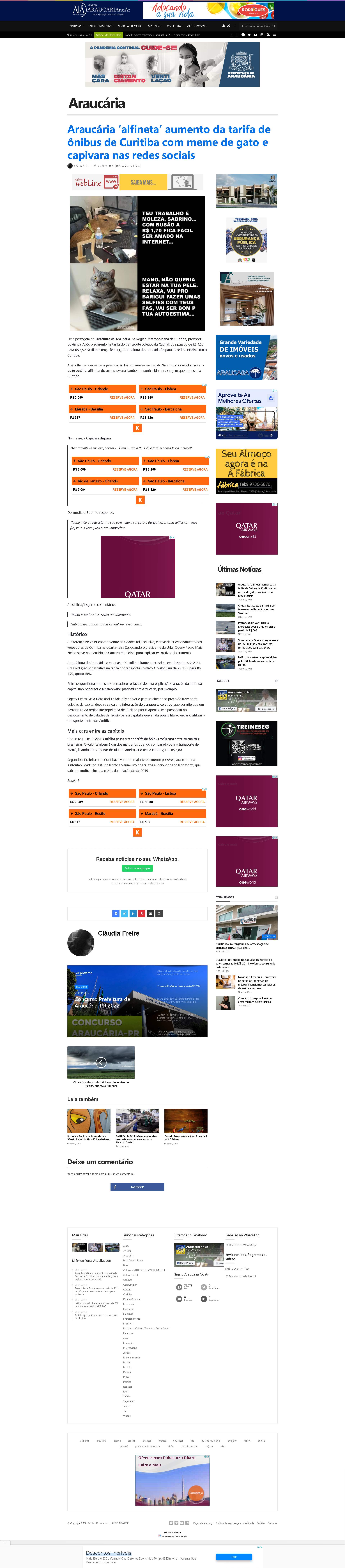 Curitiba, provocou polêmica. Após o aumento na tarifa do transporte coletivo da Capital, que passou de R$ 4,50 para R$ 5,50 na última terça-feira (1), a Prefeitura de Araucária foi para as redes sociais cutucar