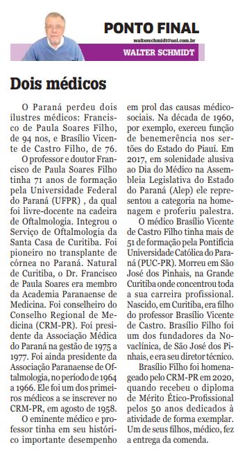 O Paraná perdeu dois ilustres médicos: Francisco de Paula Soares Filho, de 94 nos, e Brasílio Vicente de Castro Filho, de 76. O professor e doutor Francisco de Paula Soares Filho tinha 71 anos de formação pela Universidade Federal do Paraná (UFPR) , da qual foi livre-docente na cadeira de Oftalmologia. Integrou o Serviço de Oftalmologia da Santa Casa de Curitiba. Foi pioneiro no transplante de córnea no Paraná. Natural de Curitiba, o Dr. Francisco de Paula Soares era membro da Academia Paranaense de Medicina. Foi conselheiro do Conselho Regional de Medicina (CRM-PR). Foi presidente da Associação Médica do Paraná na gestão de 1975 a 1977. Foi ainda presidente da Associação Paranaense de Oftalmologia, no período de 1964 a 1966. Ele foi um dos primeiros médicos a se inscrever no CRM-PR, em agosto de 1958. O eminente médico e professor tinha em seu histórico importante desempenho em prol das causas médicosociais. Na década de 1960, por exemplo, exerceu função de benemerência nos sertões do Estado do Piauí. Em 2017, em solenidade alusiva ao Dia do Médico na Assembleia Legislativa do Estado do Paraná (Alep) ele representou a categoria na homenagem e proferiu palestra. O médico Brasílio Vicente de Castro Filho tinha mais de 51 de formação pela Pontifícia Universidade Católica do Paraná (PUC-PR). Morreu em São José dos Pinhais, na Grande Curitiba onde concentrou toda a sua carreira profissional. Nascido, em Curitiba, era fi lho do professor Brasílio Vicente de Castro. Brasílio Filho foi um dos fundadores da Novaclínica, de São José dos Pinhais, e era seu diretor técnico. Brasílio Filho foi homenageado pelo CRM-PR em 2020, quando recebeu o diploma de Mérito Ético-Profi ssional pelos 50 anos dedicados à atividade de forma exemplar. Um de seus fi lhos, médico, fez a entrega da comenda