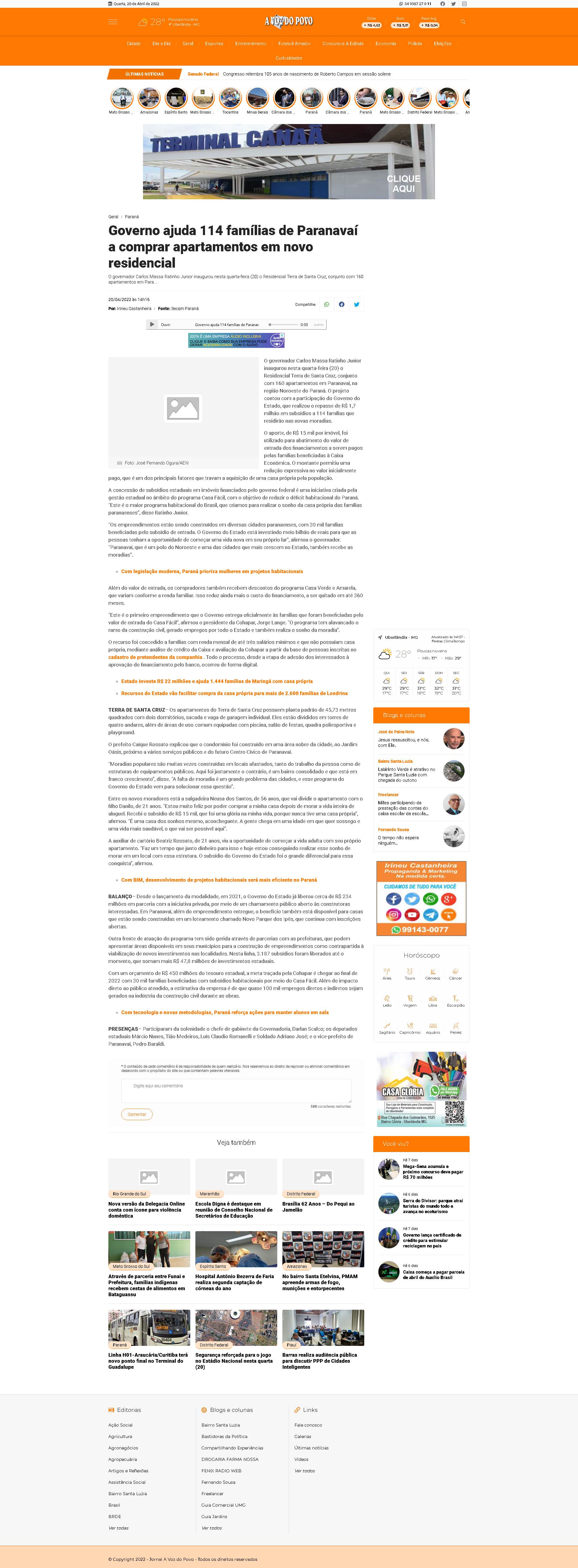 governador Carlos Massa Ratinho Junior inaugurou nesta quarta-feira (20) o Residencial Terra de Santa Cruz, conjunto com 160 apartamentos em Paranavaí, na região Noroeste do Paraná. O projeto contou com a participação do