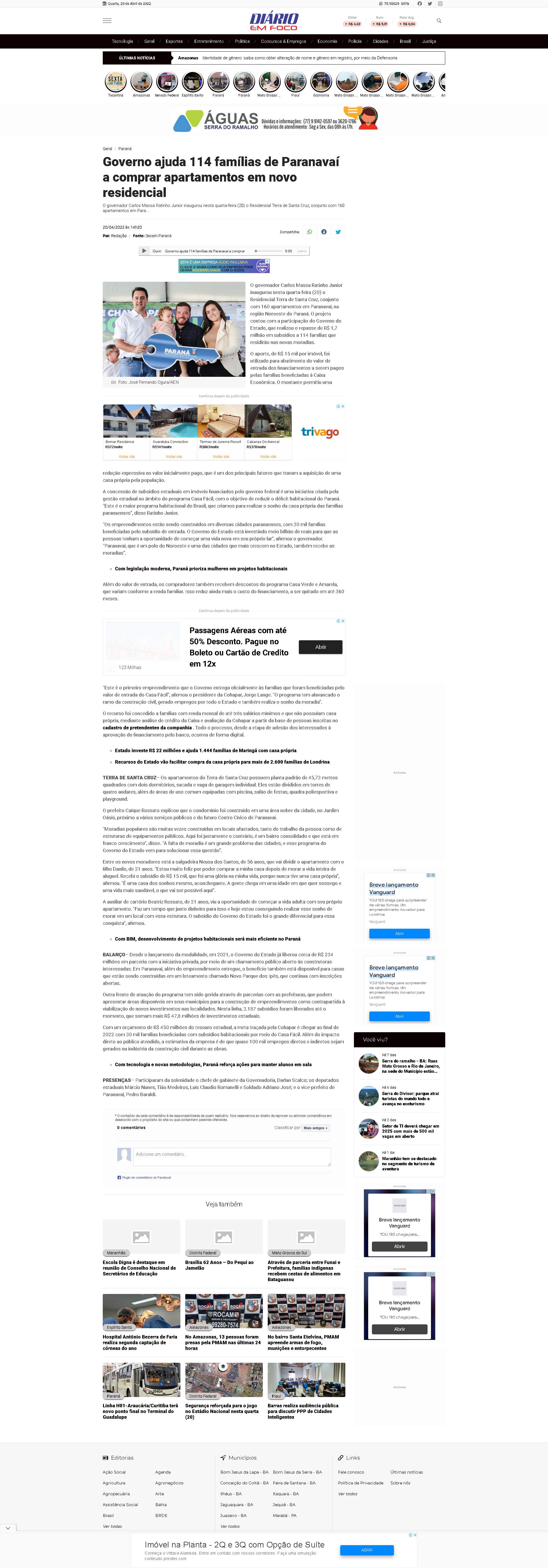 governador Carlos Massa Ratinho Junior inaugurou nesta quarta-feira (20) o Residencial Terra de Santa Cruz, conjunto com 160 apartamentos em Paranavaí, na região Noroeste do