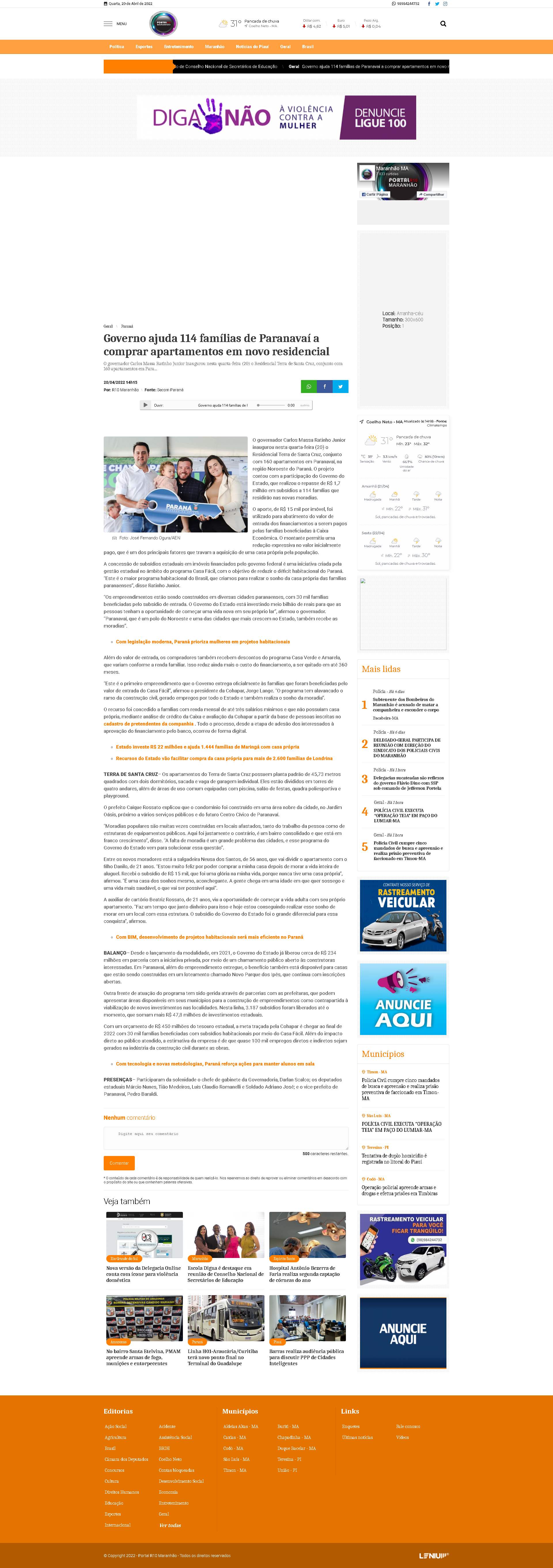 governador Carlos Massa Ratinho Junior inaugurou nesta quarta-feira (20) o Residencial Terra de Santa Cruz, conjunto com 160 apartamentos em Paranavaí, na região Noroeste do