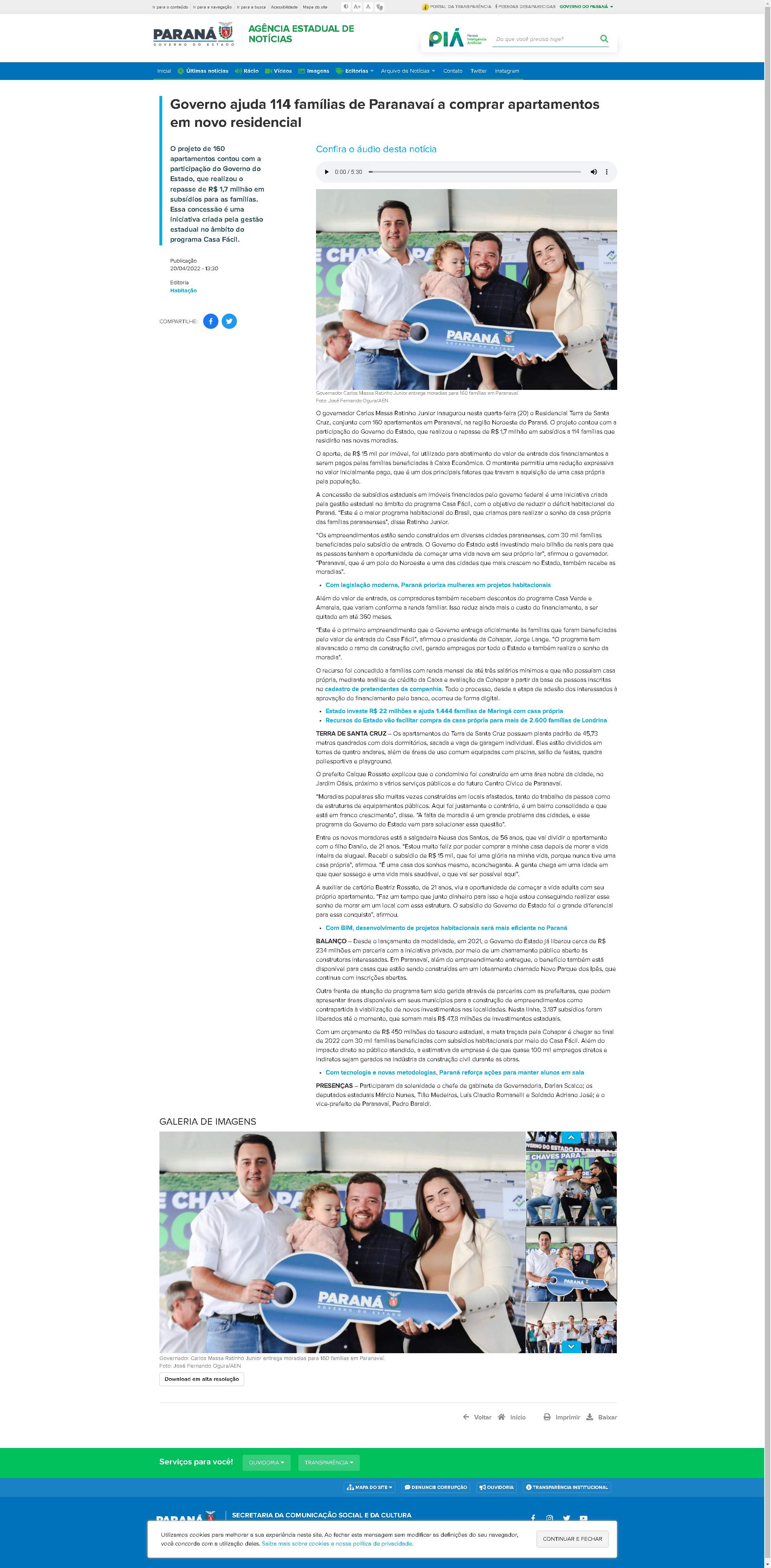 “Os empreendimentos estão sendo construídos em diversas cidades paranaenses, com 30 mil famílias beneficiadas pelo subsídio de entrada. O