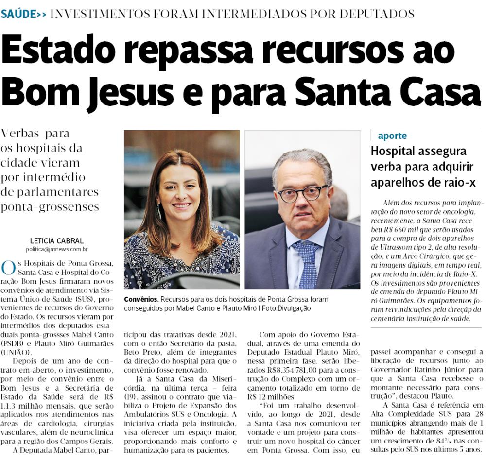 Ratinho Júnior para que a Santa Casa recebesse o montante necessário para construção”, destacou Plauto.