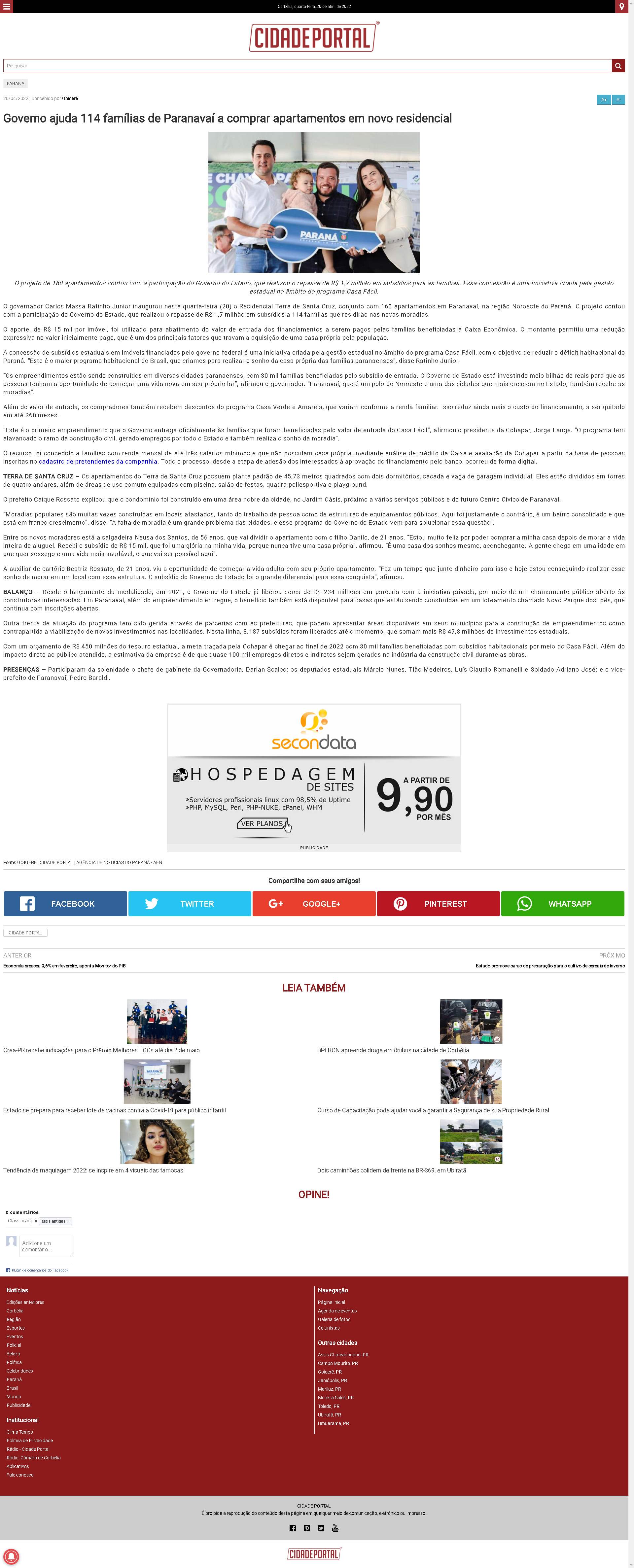 governador Carlos Massa Ratinho Junior inaugurou nesta quarta-feira (20) o Residencial Terra de Santa Cruz, conjunto com 160 apartamentos em Paranavaí, na região Noroeste do