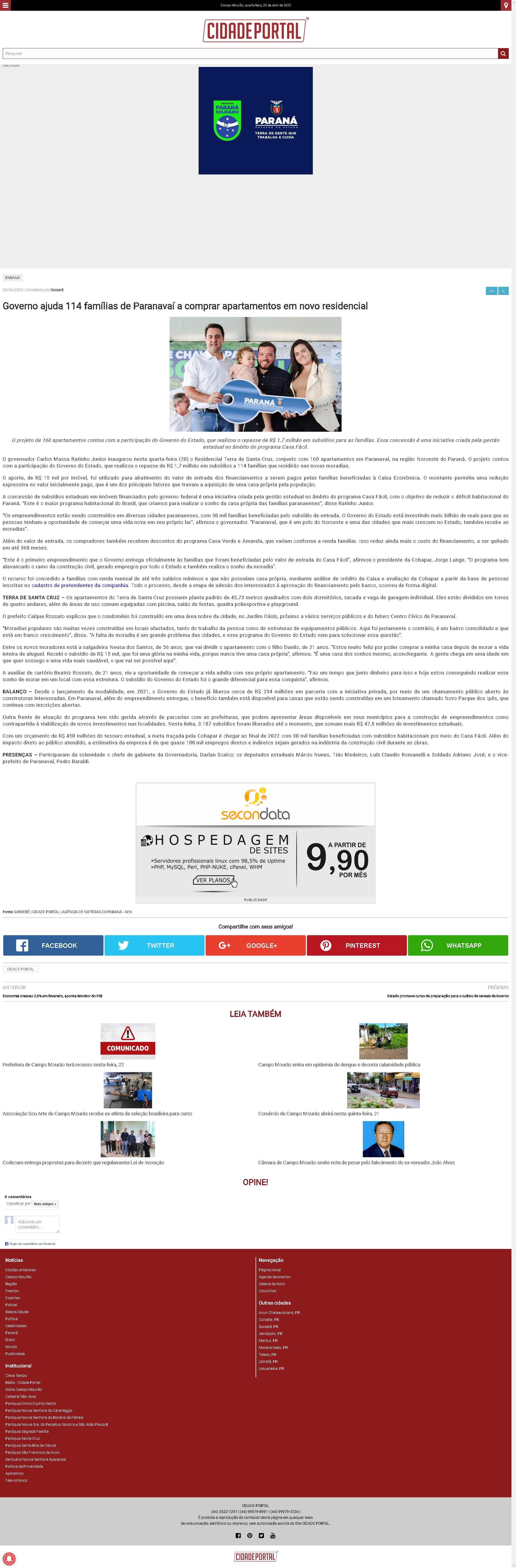 governador Carlos Massa Ratinho Junior inaugurou nesta quarta-feira (20) o Residencial Terra de Santa Cruz, conjunto com 160 apartamentos em Paranavaí, na região Noroeste do