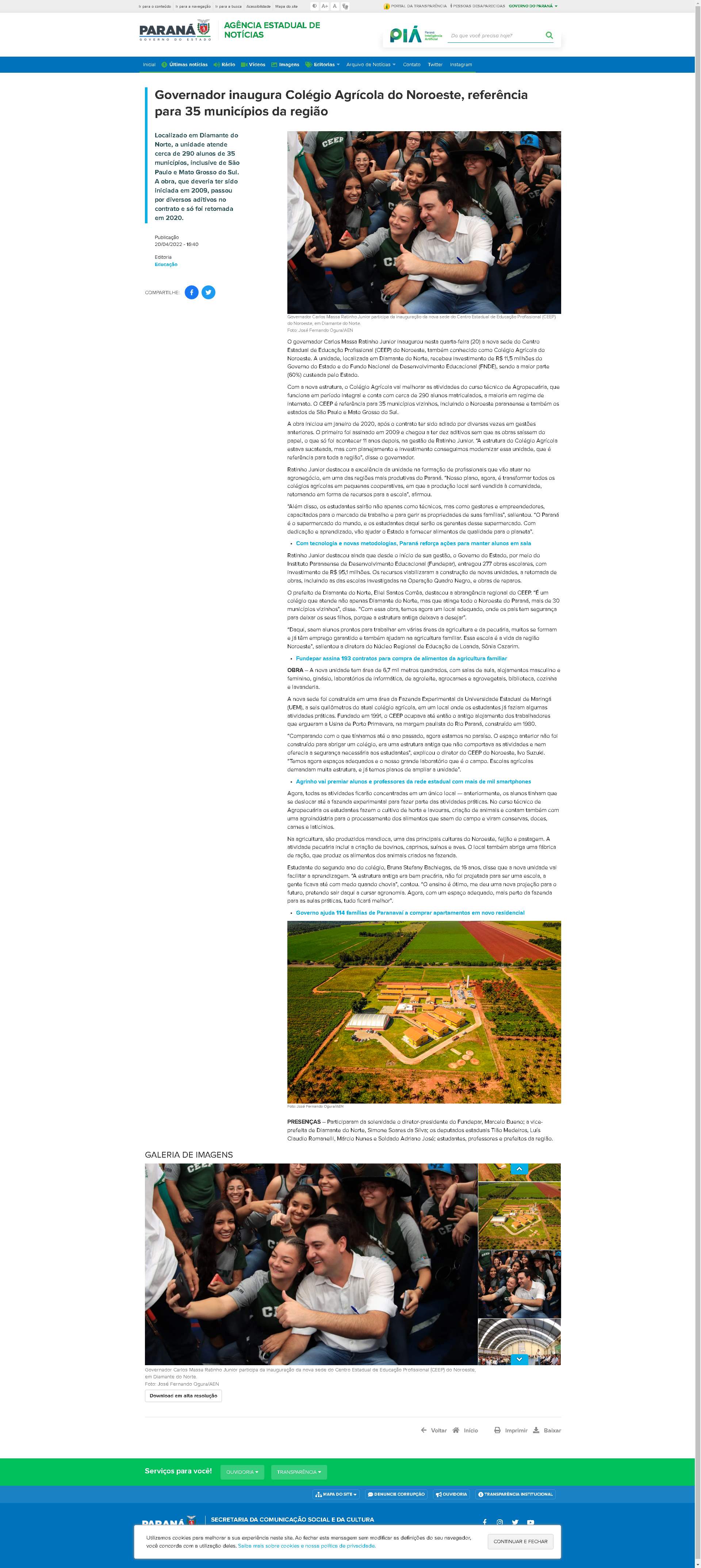 governador Carlos Massa Ratinho Junior inaugurou nesta quarta-feira (20) a nova sede do Centro Estadual de Educação Profissional (CEEP) do Noroeste, também conhecido como Colégio Agrícola do Noroeste. A unidade, localizada em Diamante do Norte, recebeu investimento de R$ 11,5 milhões do