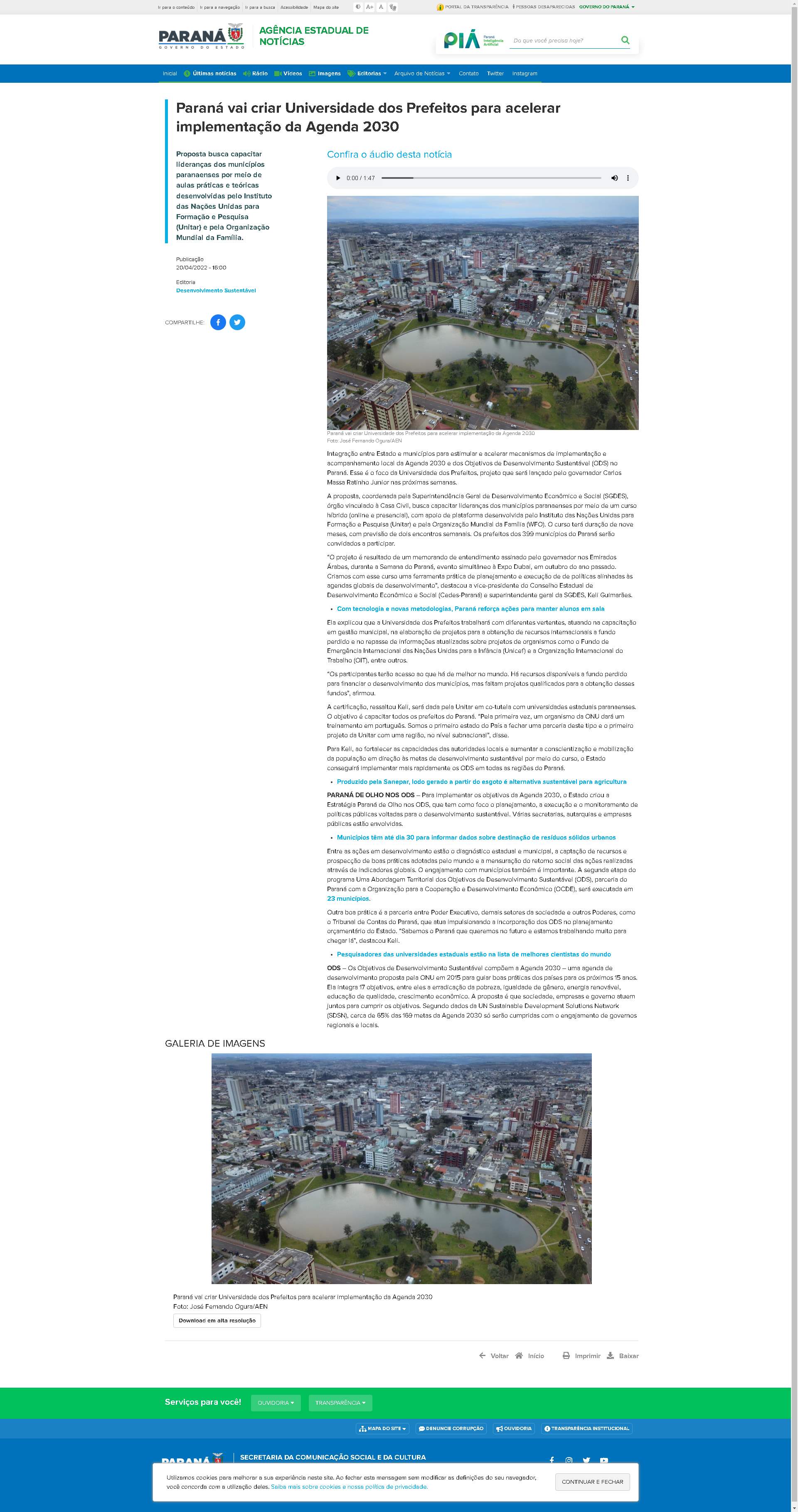 Paraná de Olho nos ODS, que tem como foco o planejamento, a execução e o monitoramento de políticas públicas voltadas para o desenvolvimento sustentável. Várias secretarias, autarquias e empresas públicas estão envolvidas.