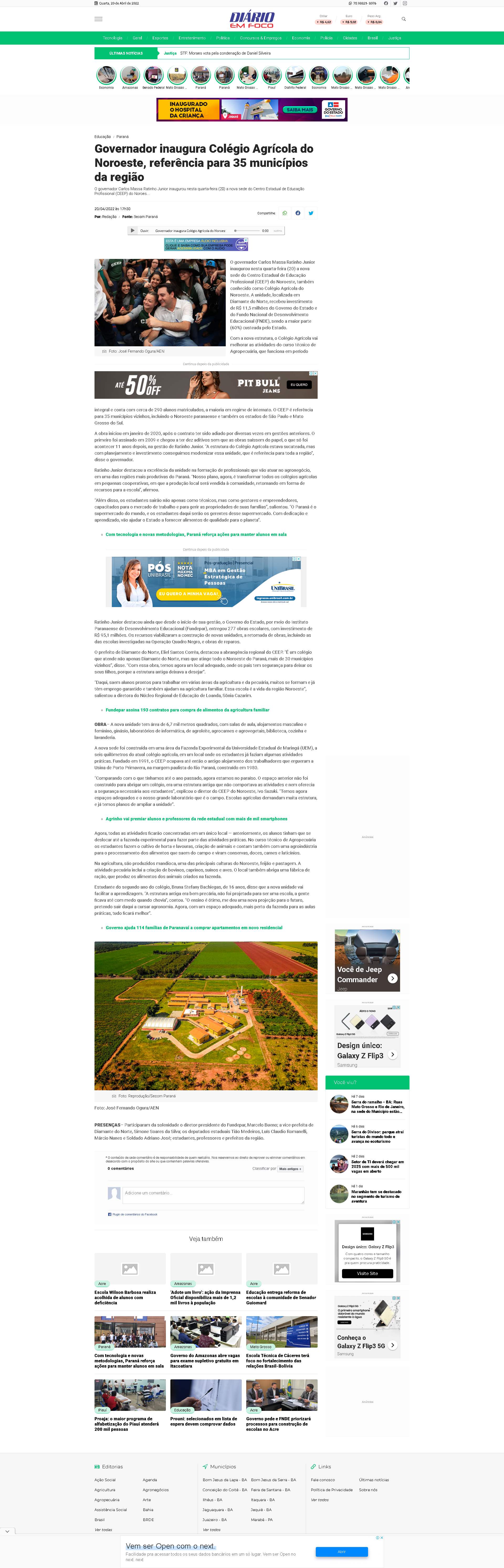 governador Carlos Massa Ratinho Junior inaugurou nesta quarta-feira (20) a nova sede do Centro Estadual de Educação Profissional (CEEP) do Noroeste, também conhecido como Colégio Agrícola do Noroeste. A unidade, localizada em Diamante do Norte, recebeu investimento de R$ 11,5 milhões do