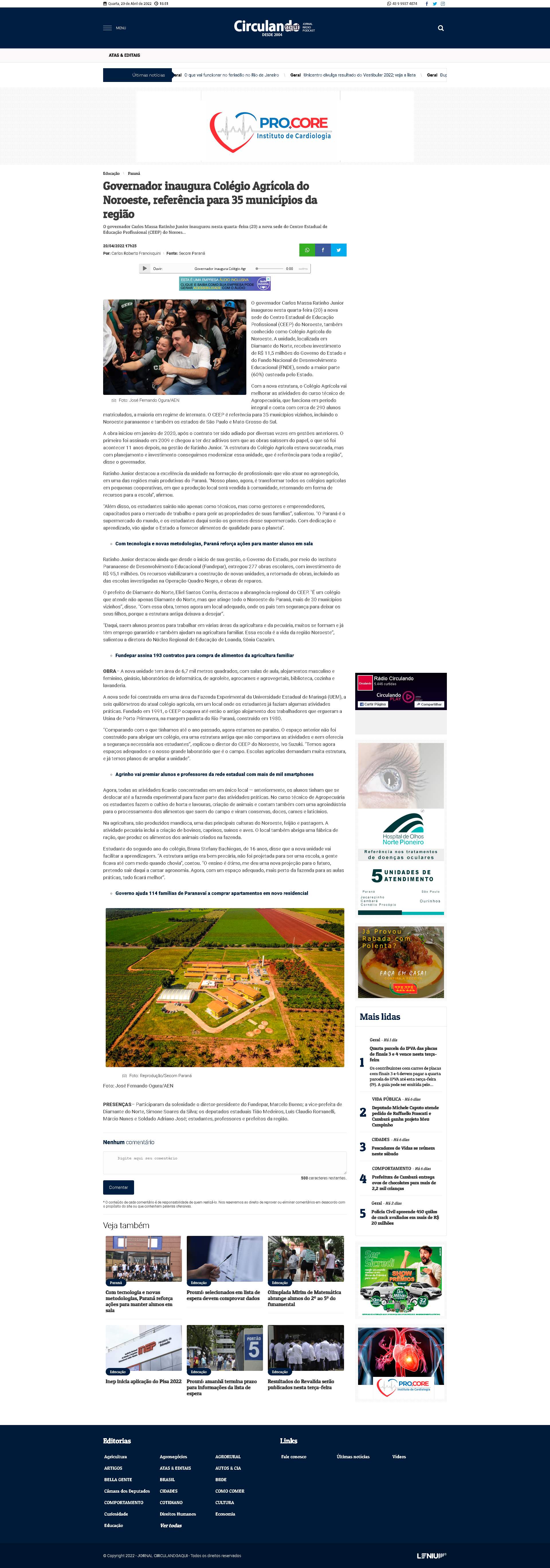 governador Carlos Massa Ratinho Junior inaugurou nesta quarta-feira (20) a nova sede do Centro Estadual de Educação Profissional (CEEP) do Noroeste, também conhecido como Colégio Agrícola do Noroeste. A unidade, localizada em Diamante do Norte, recebeu investimento de R$ 11,5 milhões do