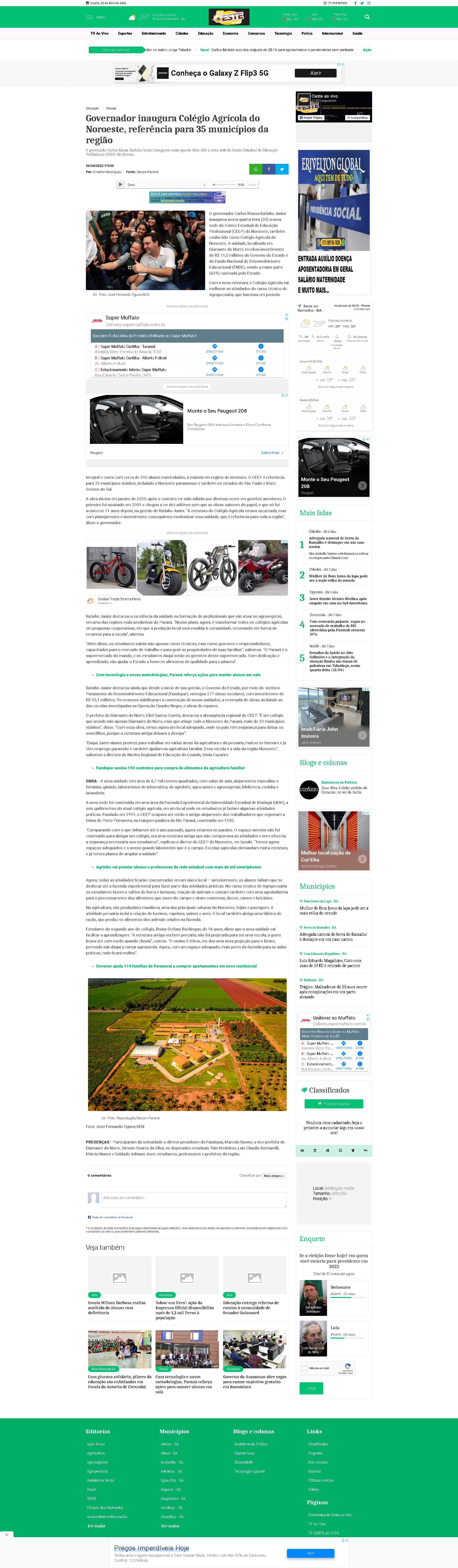 governador Carlos Massa Ratinho Junior inaugurou nesta quarta-feira (20) a nova sede do Centro Estadual de Educação Profissional (CEEP) do Noroeste, também conhecido como Colégio Agrícola do Noroeste. A unidade, localizada em Diamante do Norte, recebeu investimento de R$ 11,5 milhões do