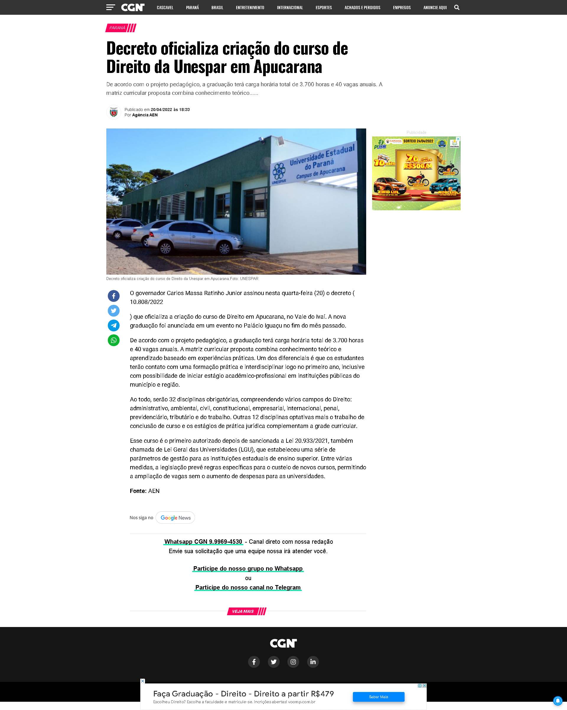 governador Carlos Massa Ratinho Junior assinou nesta quarta-feira (20) o decreto (10.808/2022) que oficializa a criação do curso de Direito em Apucarana, no Vale do Ivaí. A nova graduação foi anunciada em um evento no Palácio Iguaçu no fim do mês passado.