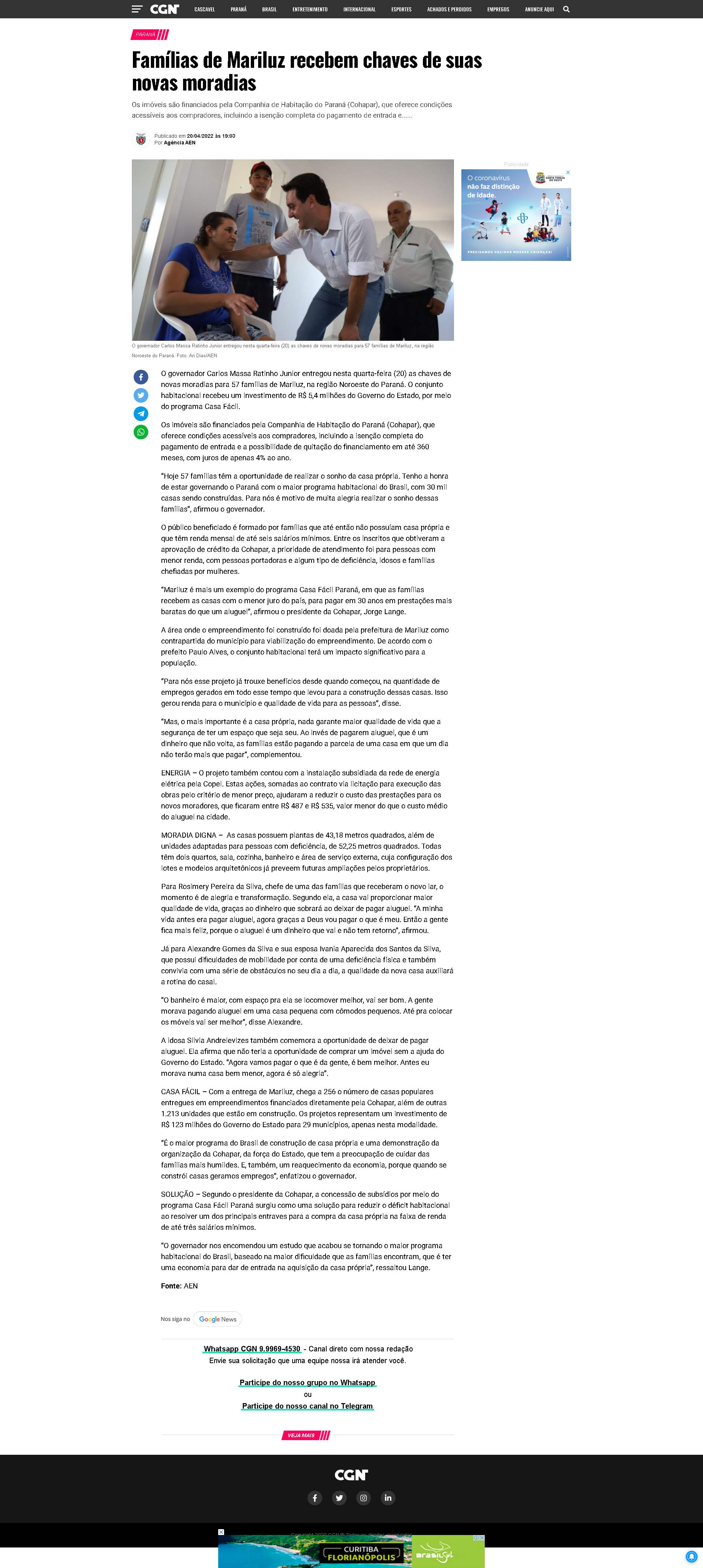 “Mariluz é mais um exemplo do programa Casa Fácil Paraná, em que as famílias recebem as casas com o menor juro do país, para pagar em 30 anos em prestações mais baratas do que um aluguel”, afirmou o presidente da