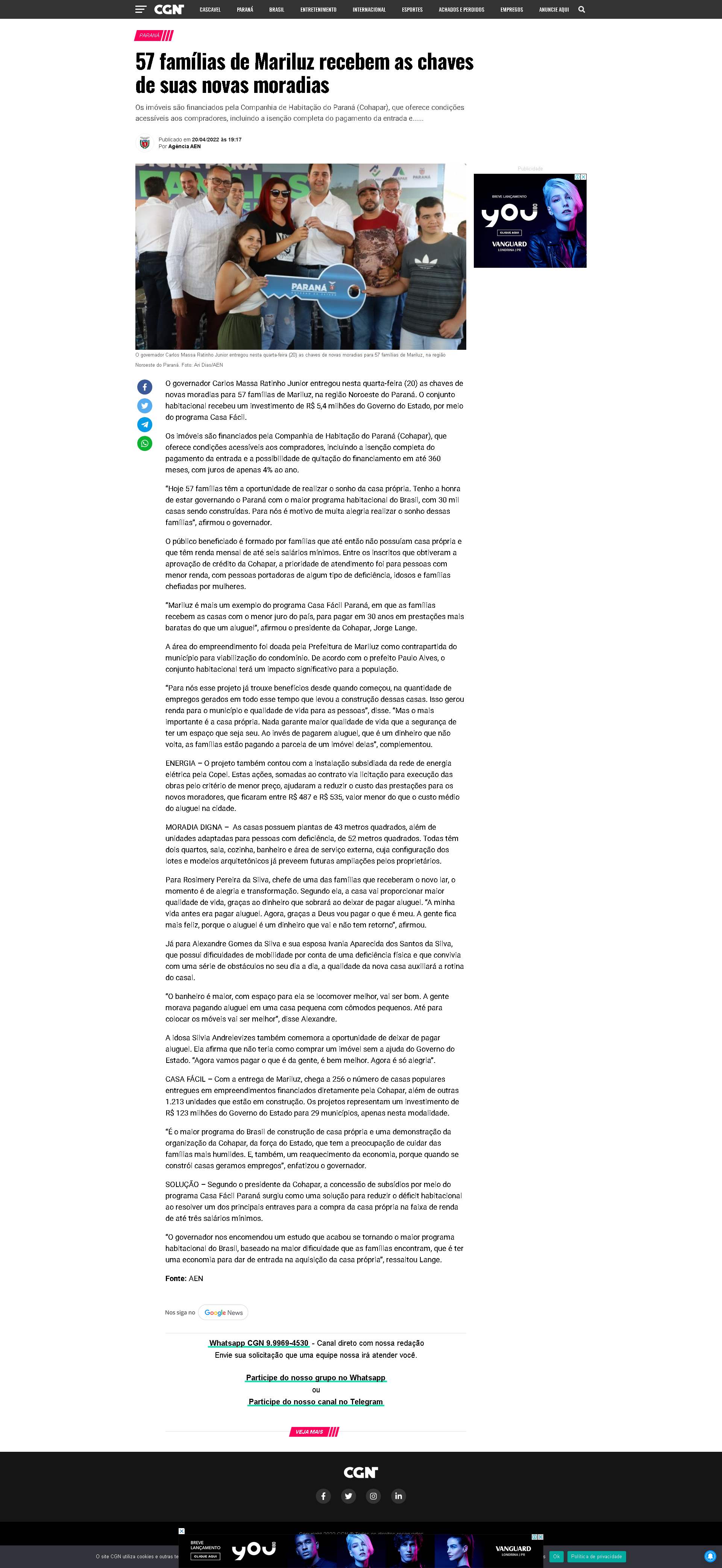 “Mariluz é mais um exemplo do programa Casa Fácil Paraná, em que as famílias recebem as casas com o menor juro do país, para pagar em 30 anos em prestações mais baratas do que um aluguel”, afirmou o presidente da