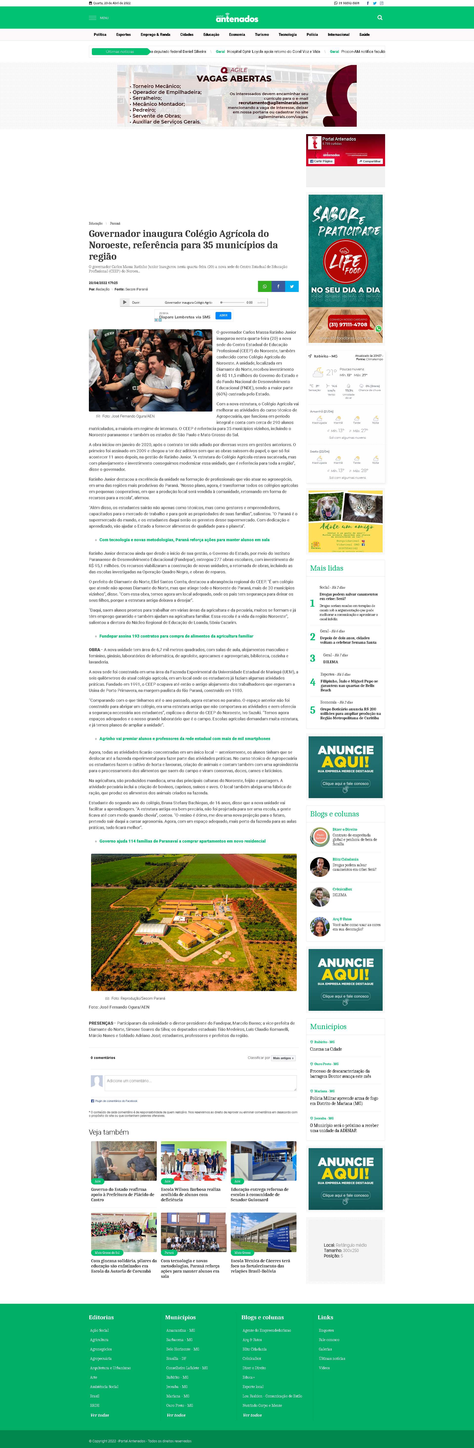 governador Carlos Massa Ratinho Junior inaugurou nesta quarta-feira (20) a nova sede do Centro Estadual de Educação Profissional (CEEP) do Noroeste, também conhecido como Colégio Agrícola do Noroeste. A unidade, localizada em Diamante do Norte, recebeu investimento de R$ 11,5 milhões do