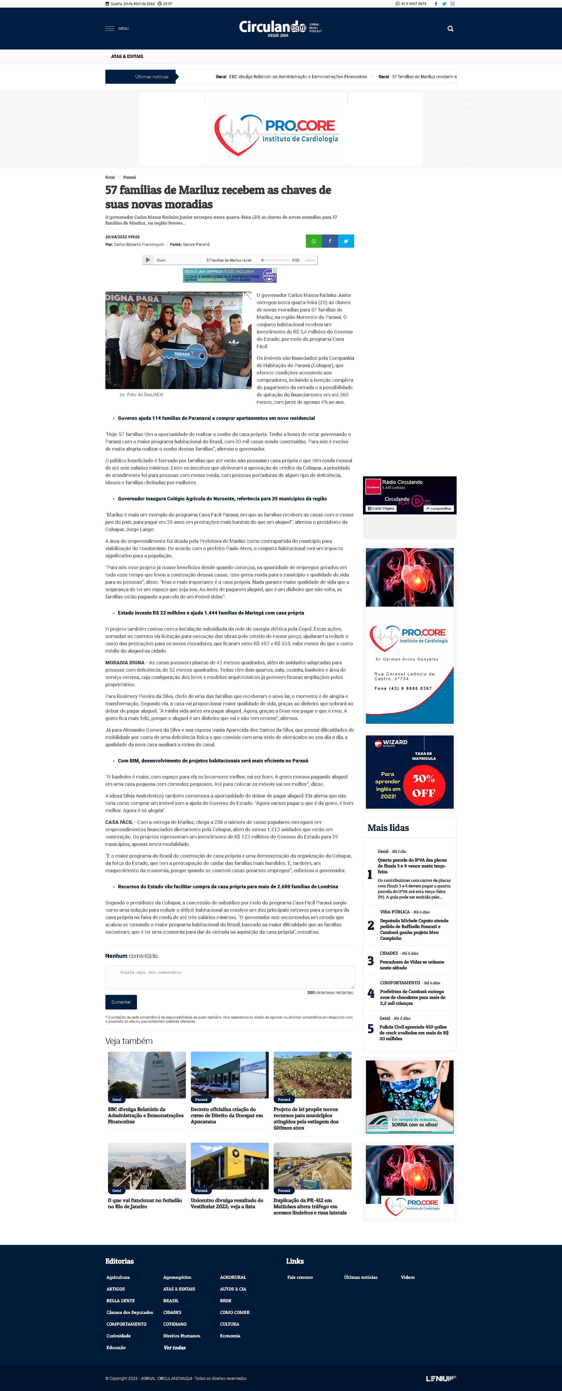 governador Carlos Massa Ratinho Junior entregou nesta quarta-feira (20) as chaves de novas moradias para 57 famílias de Mariluz, na região Noroeste do