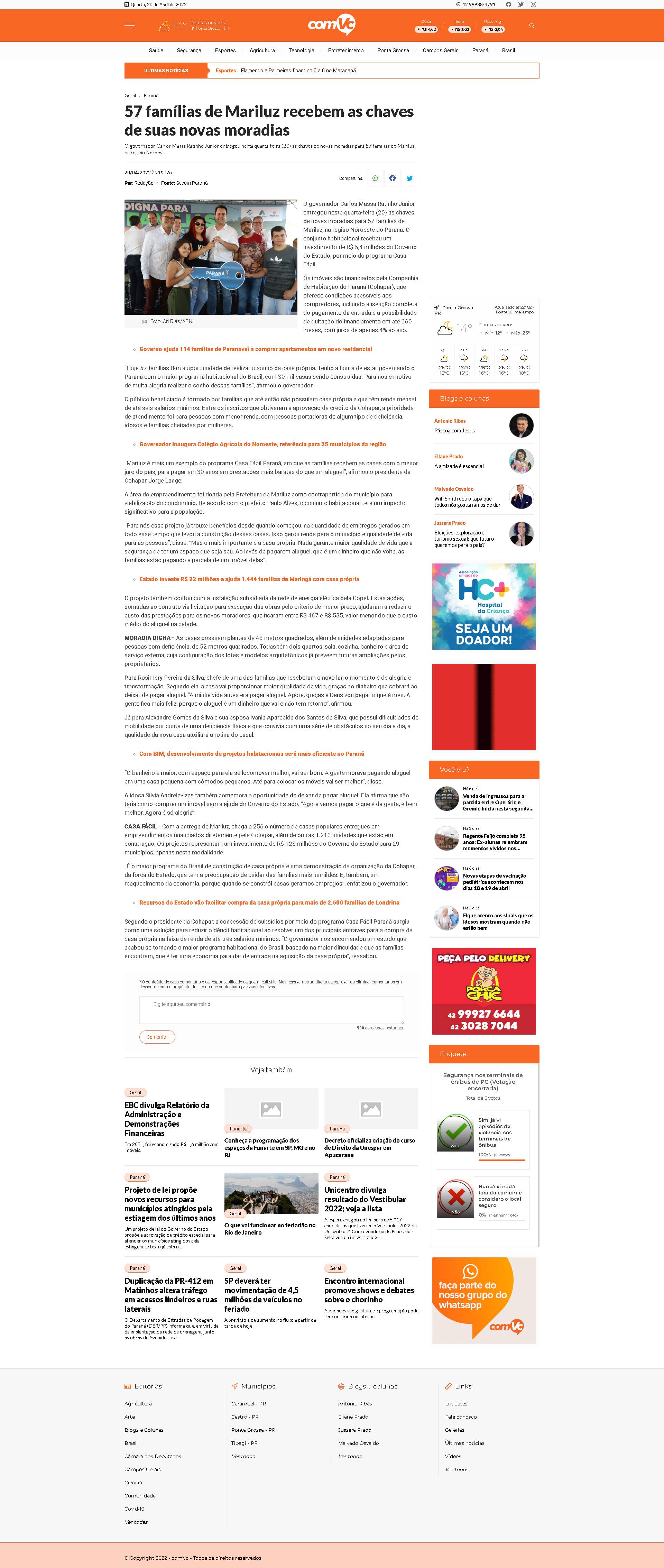 “Mariluz é mais um exemplo do programa Casa Fácil Paraná, em que as famílias recebem as casas com o menor juro do país, para pagar em 30 anos em prestações mais baratas do que um aluguel”, afirmou o presidente da