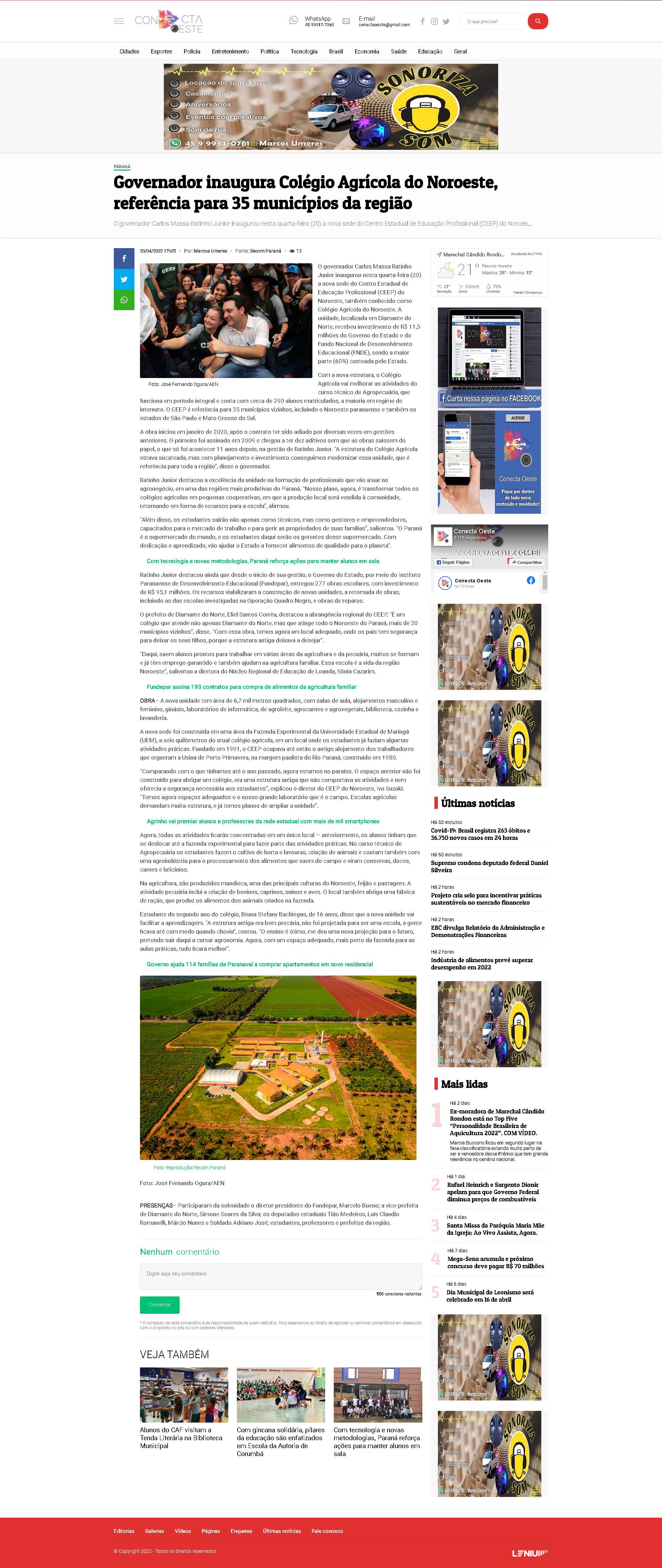 Estado. Com a nova estrutura, o Colégio Agrícola vai melhorar as atividades do curso técnico de Agropecuária, que funciona em período integral e conta com cerca de 290 alunos matriculados, a maioria em regime de internato. O CEEP é referência para 35 municípios vizinhos, incluindo o Noroeste paranaense e também os estados de São Paulo e Mato Grosso do Sul. A obra iniciou em janeiro de 2020, após o contrato ter sido adiado por diversas vezes em gestões anteriores. O primeiro foi assinado em 2009 e chegou a ter dez aditivos sem que as obras saíssem do papel, o que só foi acontecer 11 anos depois, na gestão de