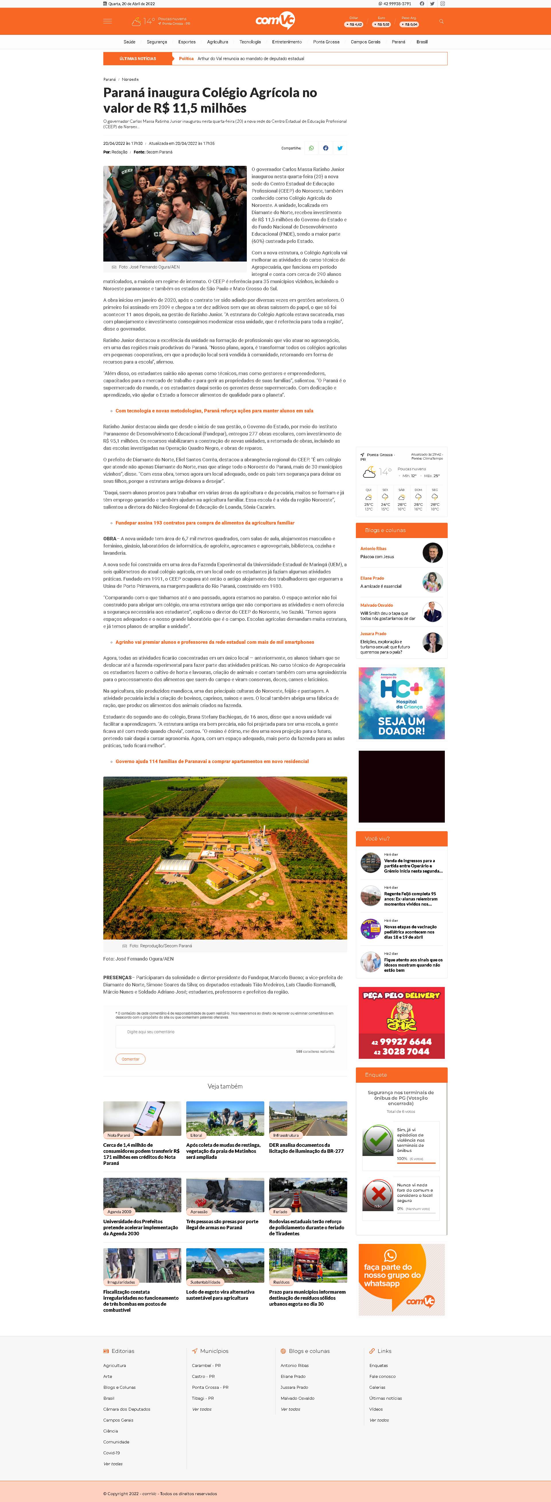 governador Carlos Massa Ratinho Junior inaugurou nesta quarta-feira (20) a nova sede do Centro Estadual de Educação Profissional (CEEP) do Noroeste, também conhecido como Colégio Agrícola do Noroeste. A unidade, localizada em Diamante do Norte, recebeu investimento de R$ 11,5 milhões do