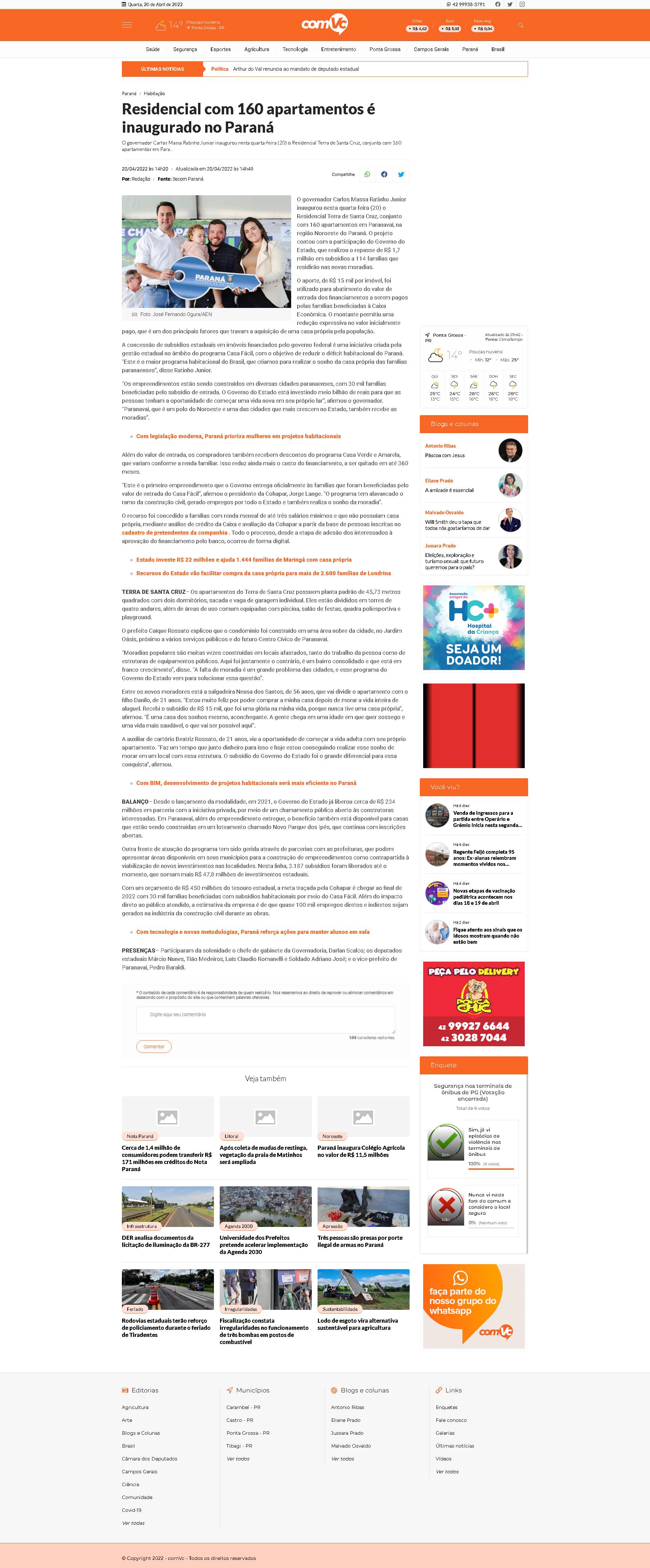 governador Carlos Massa Ratinho Junior inaugurou nesta quarta-feira (20) o Residencial Terra de Santa Cruz, conjunto com 160 apartamentos em Paranavaí, na região Noroeste do Paraná. O projeto contou com a participação do