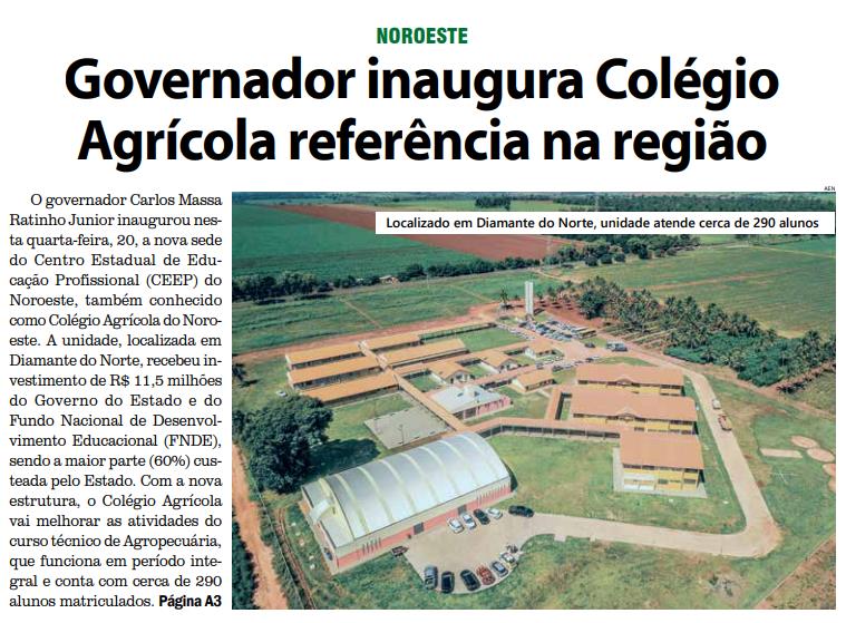 O governador Carlos Massa Ratinho Junior inaugurou nesta quarta-feira, 20, a nova sede do Centro Estadual de Educação Profissional (CEEP) do Noroeste, também conhecido como Colégio Agrícola do Noroeste. A unidade, localizada em Diamante do Norte, recebeu investimento de R$ 11,5 milhões do Governo do Estado e do Fundo Nacional de Desenvolvimento Educacional (FNDE), sendo a maior parte (60%) custeada pelo Estado. Com a nova estrutura, o Colégio Agrícola vai melhorar as atividades do curso técnico de Agropecuária, que funciona em período integral e conta com cerca de 290 alunos matriculados. Página A3