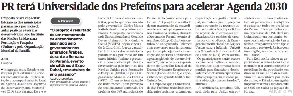 Integração entre Estado e municípios para estimular e acelerar mecanismos de implementação e acompanhamento local da Agenda 2030 e dos Objetivos de Desenvolvimento Sustentável (ODS) no Paraná. Esse é ofoco da Universidade dos Prefeitos, projeto que será lançado pelo governador Carlos Massa Ratinho Junior nas próximas semanas. A proposta, coordenada pela Superintendência Geral de Desenvolvimento Econômico e Social (SGDES), órgão vinculado à Casa Civil, busca capacitar lideranças dos municípios paranaenses por meio de um curso híbrido (online e presencial), com apoio de plataforma desenvolvida pelo Instituto das Nações Unidas para Formação e Pesquisa (Unitar) e pela Organização Mundial da Família (WFO). O curso terá duração de nove meses, com previsão de dois encontros semanais. Os prefeitos dos 399 municípios doParaná serão convidados a participar. “O projeto é resultado de um memorando de entendimento assinado pelo governador nos Emirados Árabes, durante a Semana do Paraná, evento simultâneo à Expo Dubai, em outubro do ano passado. Criamos com esse curso uma ferramenta prática de planejamento e execução de políticas alinhadas às agendas globais de desenvolvimento”, destacou a vice-presidente do Conselho Estadual de Desenvolvimento Econômico e Social (Cedes-Paraná) e superintendente geral da SGDES, Keli Guimarães. Ela explicou que a Universidade dos Prefeitos trabalhará com diferentes vertentes, atuando nacapacitação em gestão municipal, na elaboração de projetos para a obtenção de recursos internacionais a fundo perdido e no repasse de informações atualizadas sobre projetos de organismos como o Fundo de Emergência Internacional das Nações Unidas para a Infância (Unicef) e a Organização Internacional do Trabalho (OIT), entre outros. “Os participantes terão acesso ao que há de melhor no mundo. Há recursos disponíveis a fundo perdido para fi nanciar o desenvolvimento dos municípios, mas faltam projetos qualifi cados para a obtenção desses fundos”, afi rmou. A certifi cação, ressaltou Keli, será dada pela Unitar em co-tutela com universidades estaduais paranaenses. O objetivo é capacitar todos os prefeitos do Paraná. “Pela primeira vez, um organismo da ONU dará um treinamento em português. Somos o primeiro estado do País a fechar uma parceria deste tipo e o primeiro projeto da Unitar com uma região, no nível subnacional”, disse. Para Keli, ao fortalecer as capacidades das autoridades locais e aumentar a conscientização e mobilização da população em direção às metas de desenvolvimento sustentável por meio do curso, o Estado conseguirá implementar mais rapidamente os ODS em todas as regiões do Paraná.