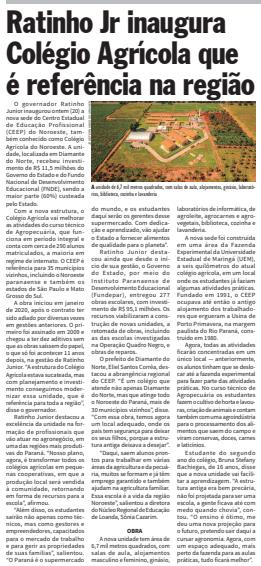 O governador Ratinho Junior inaugurou ontem (20) a nova sede do Centro Estadual de Educação Profissional (CEEP) do Noroeste, também conhecido como Colégio Agrícola do Noroeste. A unidade, localizada em Diamante do Norte, recebeu investimento de R$ 11,5 milhões do Governo do Estado e do Fundo Nacional de Desenvolvimento Educacional (FNDE), sendo a maior parte (60%) custeada pelo Estado. Com a nova estrutura, o Colégio Agrícola vai melhorar as atividades do curso técnico de Agropecuária, que funciona em período integral e conta com cerca de 290 alunos matriculados, a maioria em regime de internato. O CEEP é referência para 35 municípios vizinhos, incluindo o Noroeste paranaense e também os estados de São Paulo e Mato Grosso do Sul. A obra iniciou em janeiro de 2020, após o contrato ter sido adiado por diversas vezes em gestões anteriores. O primeiro foi assinado em 2009 e chegou a ter dez aditivos sem que as obras saíssem do papel, o que só foi acontecer 11 anos depois, na gestão de Ratinho Junior. “A estrutura do Colégio Agrícola estava sucateada, mas com planejamento e investimento conseguimos modernizar essa unidade, que é referência para toda a região”, disse o governador. Ratinho Junior destacou a excelência da unidade na formação de profissionais que vão atuar no agronegócio, em uma das regiões mais produtivas do Paraná. “Nosso plano, agora, é transformar todos os colégios agrícolas em pequenas cooperativas, em que a produção local será vendida à comunidade, retornando em forma de recursos para a escola”, afirmou. “Além disso, os estudantes sairão não apenas como técnicos, mas como gestores e empreendedores, capacitados para o mercado de trabalho e para gerir as propriedades de suas famílias”, salientou. “O Paraná é o supermercado do mundo, e os estudantes daqui serão os gerentes desse supermercado. Com dedicação e aprendizado, vão ajudar o Estado a fornecer alimentos de qualidade para o planeta”. Ratinho Junior destacou ainda que desde o início de sua gestão, o Governo do Estado, por meio do Instituto Paranaense de Desenvolvimento Educacional (Fundepar), entregou 277 obras escolares, com investimento de R$ 95,1 milhões. Os recursos viabilizaram a construção de novas unidades, a retomada de obras, incluindo as das escolas investigadas na Operação Quadro Negro, e obras de reparos. O prefeito de Diamante do Norte, Eliel Santos Corrêa, destacou a abrangência regional do CEEP. “É um colégio que atende não apenas Diamante do Norte, mas que atinge todo o Noroeste do Paraná, mais de 30 municípios vizinhos”, disse. “Com essa obra, temos agora um local adequado, onde os pais tem segurança para deixar os seus filhos, porque a estrutura antiga deixava a desejar”. “Daqui, saem alunos prontos para trabalhar em várias áreas da agricultura e da pecuária, muitos se formam e já têm emprego garantido e também ajudam na agricultura familiar. Essa escola é a vida da região Noroeste”, salientou a diretora do Núcleo Regional de Educação de Loanda, Sônia Cazarim. OBRA A nova unidade tem área de 6,7 mil metros quadrados, com salas de aula, alojamentos masculino e feminino, ginásio, laboratórios de informática, de agroleite, agrocarnes e agrovegetais, biblioteca, cozinha e lavanderia. A nova sede foi construída em uma área da Fazenda Experimental da Universidade Estadual de Maringá (UEM), a seis quilômetros do atual colégio agrícola, em um local onde os estudantes já faziam algumas atividades práticas. Fundado em 1991, o CEEP ocupava até então o antigo alojamento dos trabalhadores que ergueram a Usina de Porto Primavera, na margem paulista do Rio Paraná, construído em 1980. Agora, todas as atividades ficarão concentradas em um único local — anteriormente, os alunos tinham que se deslocar até a fazenda experimental para fazer parte das atividades práticas. No curso técnico de Agropecuária os estudantes fazem o cultivo de horta e lavouras, criação de animais e contam também com uma agroindústria para o processamento dos alimentos que saem do campo e viram conservas, doces, carnes e laticínios. Estudante do segundo ano do colégio, Bruna Stefany Bachiegas, de 16 anos, disse que a nova unidade vai facilitar a aprendizagem. “A estrutura antiga era bem precária, não foi projetada para ser uma escola, a gente ficava até com medo quando chovia”, contou. “O ensino é ótimo, me deu uma nova projeção para o futuro, pretendo sair daqui a cursar agronomia. Agora, com um espaço adequado, mais perto da fazenda para as aulas práticas, tudo ficará melhor”.