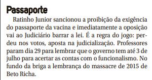 Ratinho Junior sancionou a proibição da exigência do passaporte da vacina e imediatamente a oposição vai ao Judiciário barrar a lei. É a regra do jogo: perdeu nos votos, aposta na judicialização. Professores param dia 29 para lembrar que o governo tem até 3 de julho para acertar as contas com o funcionalismo. No fundo da briga a lembrança do massacre de 2015 de Beto