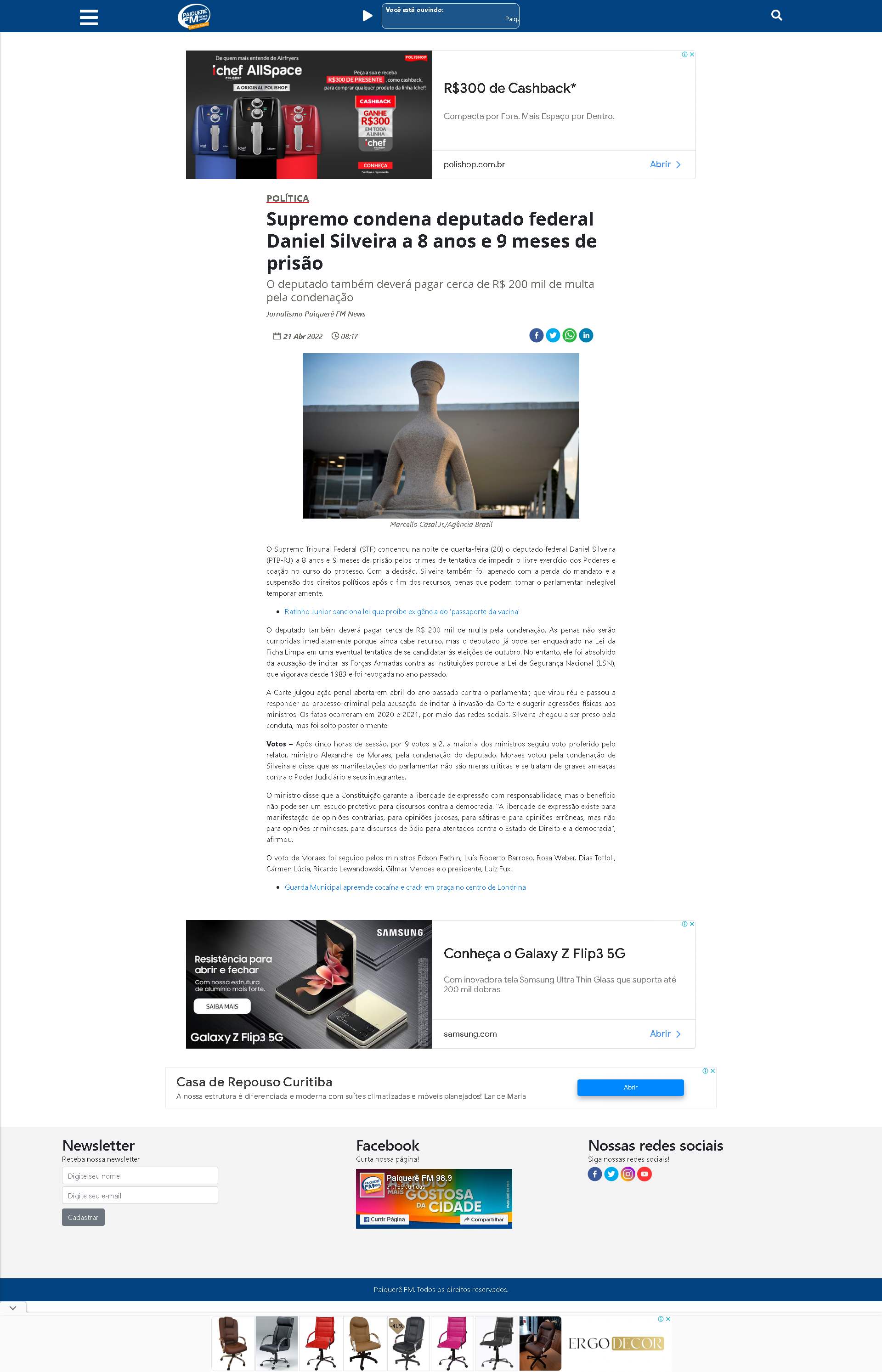 O Supremo Tribunal Federal (STF) condenou na noite de quarta-feira (20) o deputado federal Daniel Silveira (PTB-RJ) a 8 anos e 9 meses de prisão pelos crimes de tentativa de impedir o livre exercício dos Poderes e coação no curso do processo. Com a decisão, Silveira também foi apenado com a perda do mandato e a suspensão dos direitos políticos após o fim dos recursos, penas que podem tornar o parlamentar inelegível temporariamente.